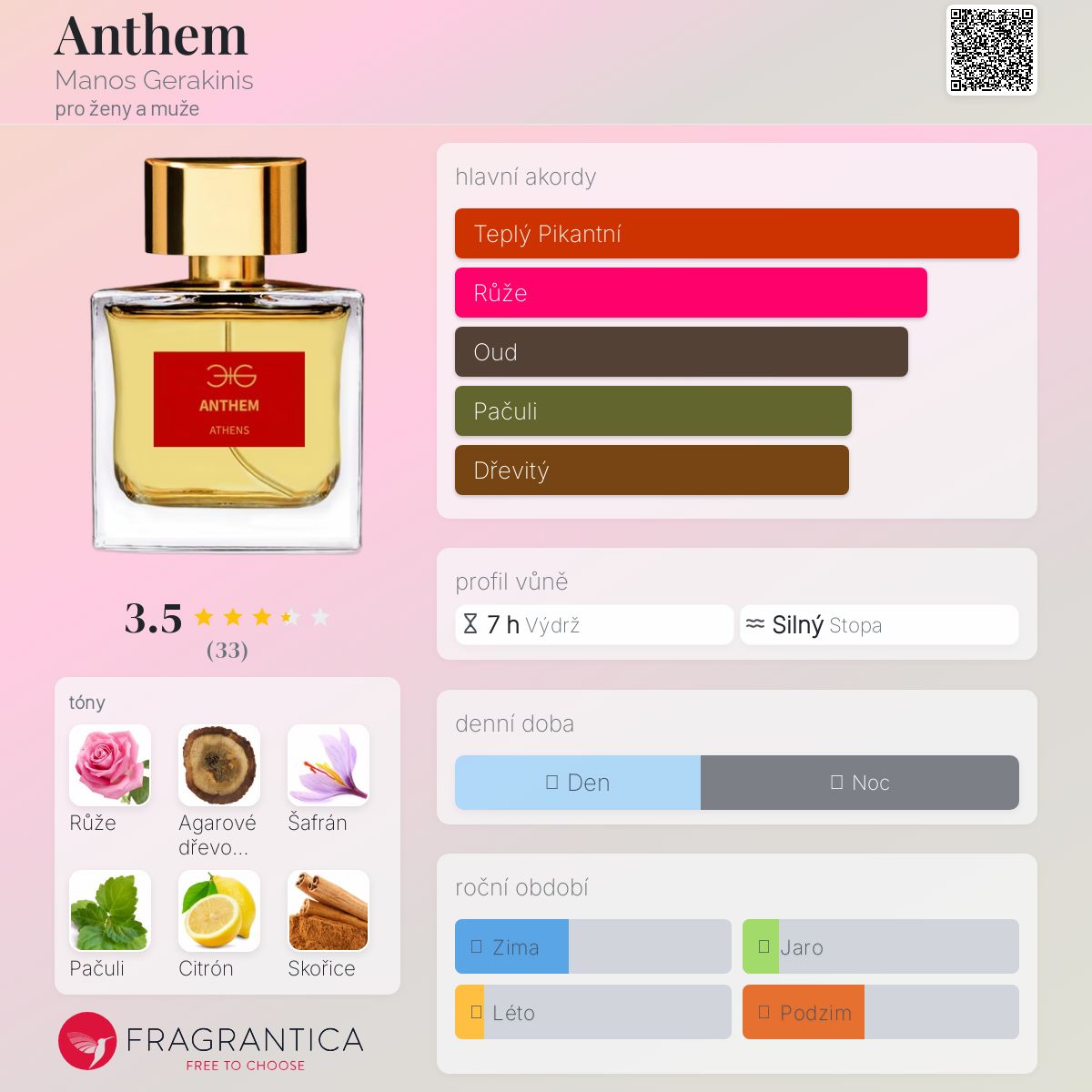 Anthem podle Manos Gerakinis je Orientální Woody vůně pro ženy a muže. Anthem byl/a uveden/a v roce 2021. "Nosem" za touto vůní je Chris Maurice. Vrchní tóny jsou Šafrán, Citrón a Labdanum; střední tóny jsouRůže, Skořice, Muškátový oříšek, Pelargónie a Ylang-Ylang ; základní tóny jsou Agarové dřevo (oud), Pačuli, Jantar (ambra), Dubový mech, Pižmo, Vanilka a Santalové dřevo.