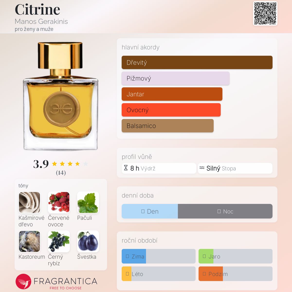 Citrine podle Manos Gerakinis je Orientální Woody vůně pro ženy a muže. Citrine byl/a uveden/a v roce 2023. "Nosem" za touto vůní je Chris Maurice. Vrchní tóny jsou Červené ovoce, Černý rybíz a Švestka; střední tóny jsouKašmírové dřevo, Pačuli, Kůže a Jantar (ambra) ; základní tóny jsou Kastoreum a Agarové dřevo (oud).