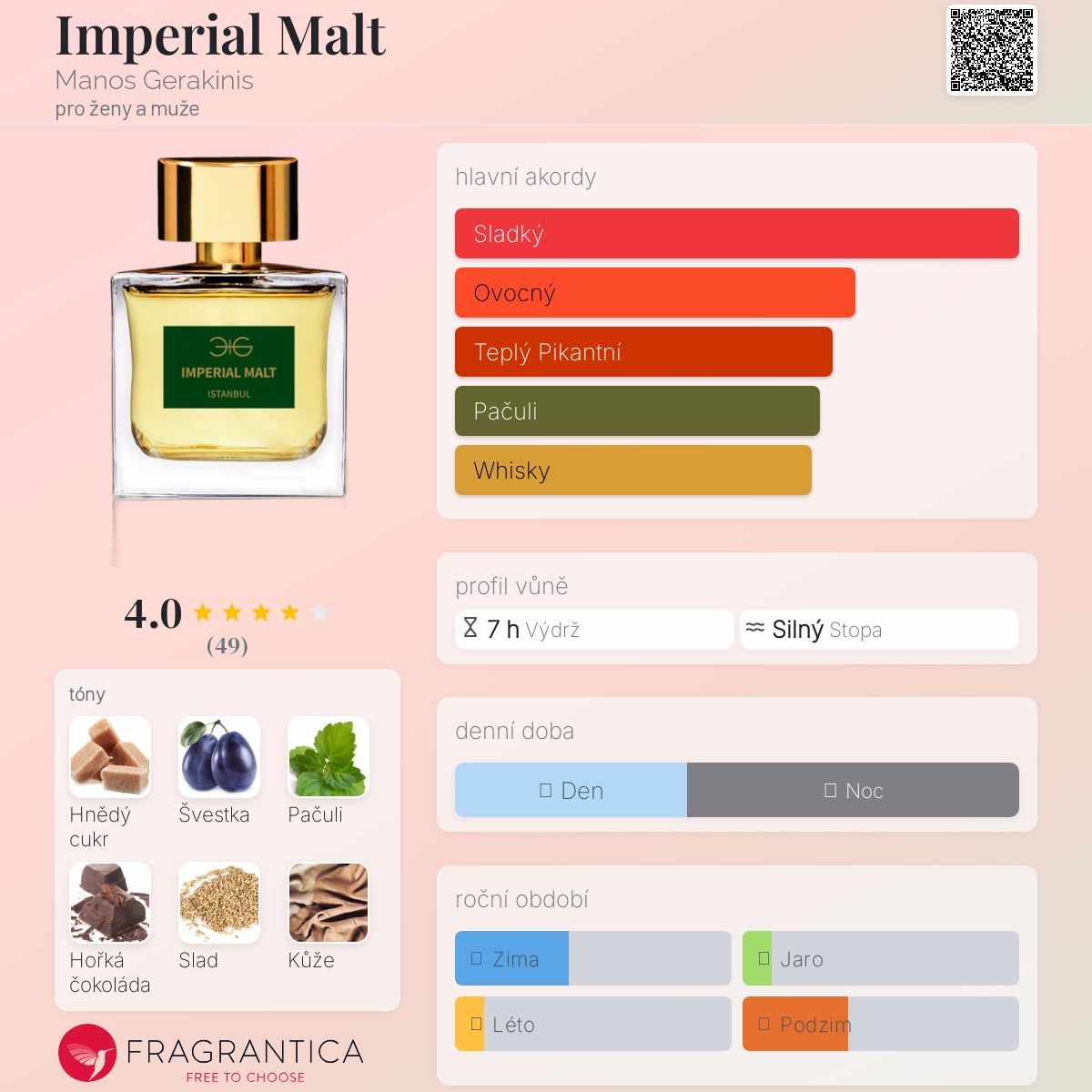 Imperial Malt podle Manos Gerakinis je Woody Spicy vůně pro ženy a muže. Toto je nová vůně. Imperial Malt byl/a uveden/a v roce 2024. "Nosem" za touto vůní je Ioanna Tanionou. Vrchní tóny jsou Hnědý cukr, Hořká čokoláda a Kokosová voda; střední tóny jsouŠvestka, Slad, Vanilka a Whisky ; základní tóny jsou Pačuli, Kůže, Dřevité tóny a Vetiver.
