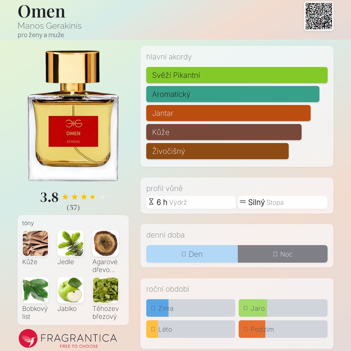 Omen podle Manos Gerakinis je Orientální Spicy vůně pro ženy a muže. Omen byl/a uveden/a v roce 2020. "Nosem" za touto vůní je Miguel Matos. Vrchní tóny jsou Bobkový list, Jablko a Šafrán; střední tóny jsouJedle balzámová, Těhozev březový a Jasmín ; základní tóny jsou Kůže, Agarové dřevo (oud), Jantar (ambra), Ambra, Fazole tonka a Pižmo.