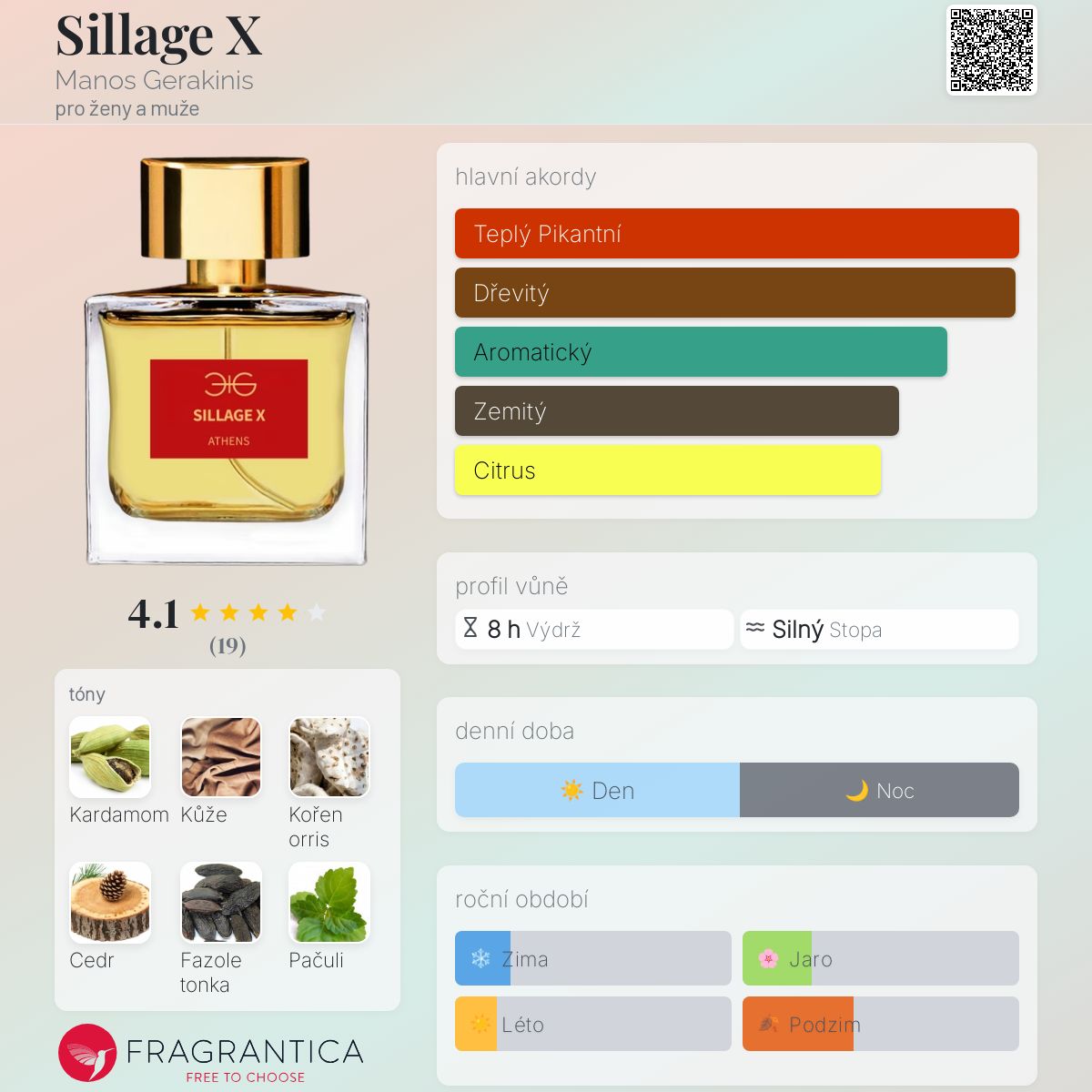 Sillage X podle Manos Gerakinis je Woody vůně pro ženy a muže. Toto je nová vůně. Sillage X byl/a uveden/a v roce 2024. "Nosem" za touto vůní je Vasiliki Psatha. Vrchní tóny jsou Kardamom, Mandarinka, Bergamot, Citrón, Fenykl a Černý pepř; střední tóny jsouKůže, Orris, Cedr a Vetiver ; základní tóny jsou Fazole tonka, Pačuli, Mech, Pižmo a Jantar (ambra).