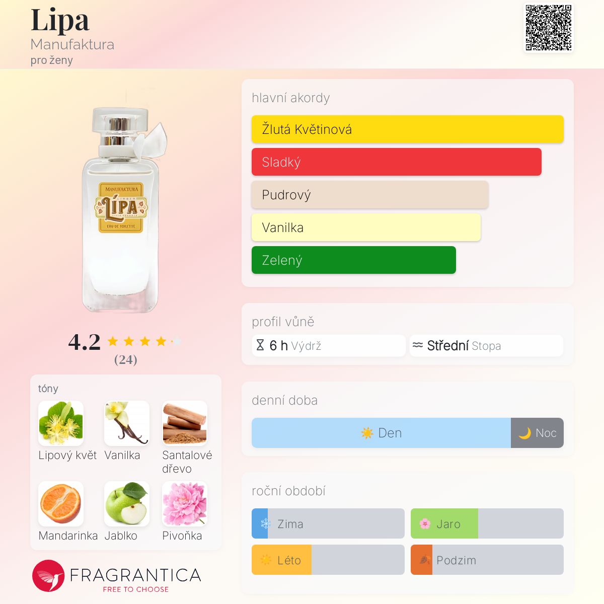 Lipa podle Manufaktura je Floral Fruity vůně pro ženy. Vrchní tóny jsou Mandarinka a Jablko; střední tóny jsouLipový květ a Pivoňka ; základní tóny jsou Vanilka, Santalové dřevo a Pižmo.