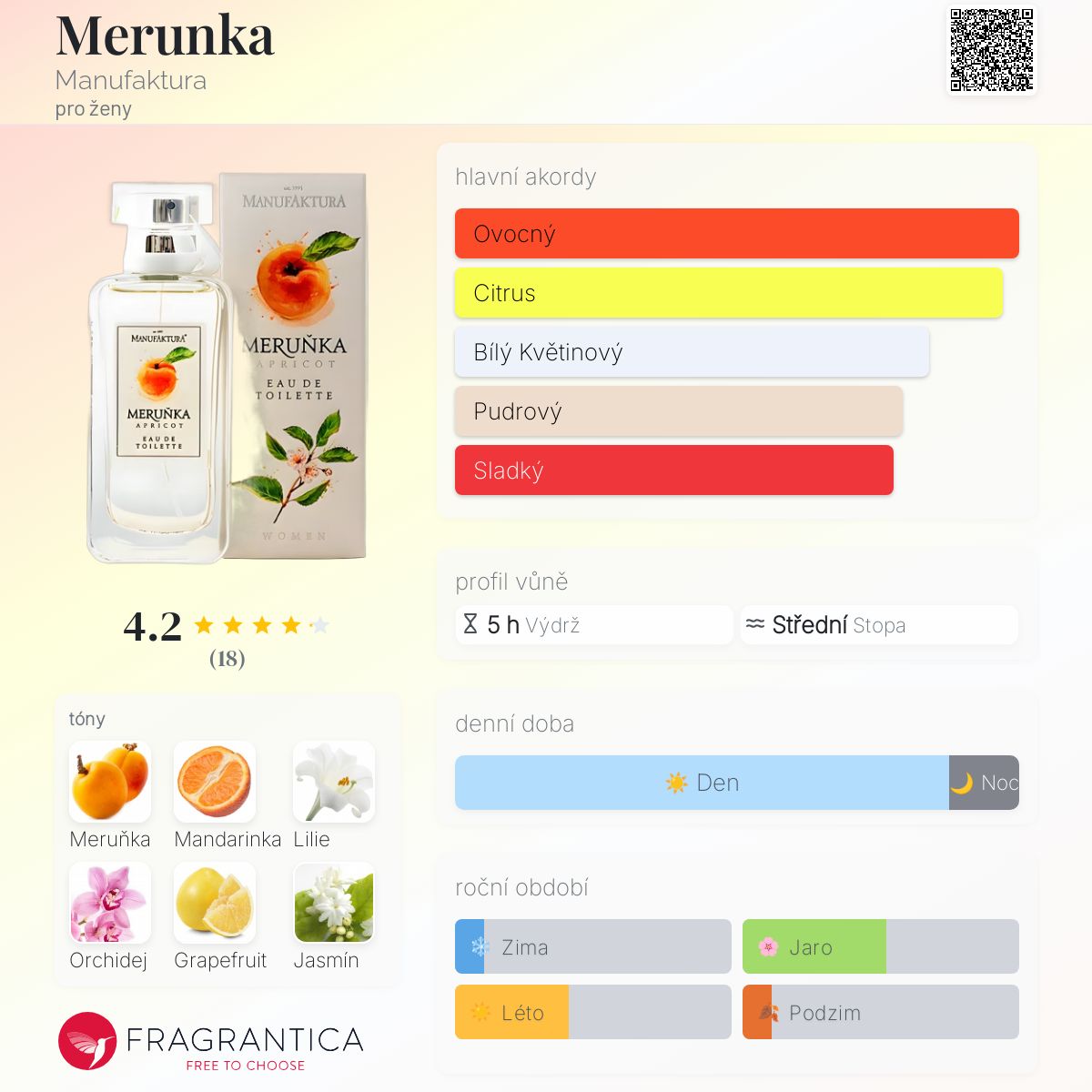 Merunka podle Manufaktura je Floral Fruity vůně pro ženy. Vrchní tóny jsou Mandarinka a Krvavý grep; střední tóny jsouMeruňka, Lilie, Orchidej a Jasmín ; základní tóny jsou Santalové dřevo, Pižmo a Ambra.