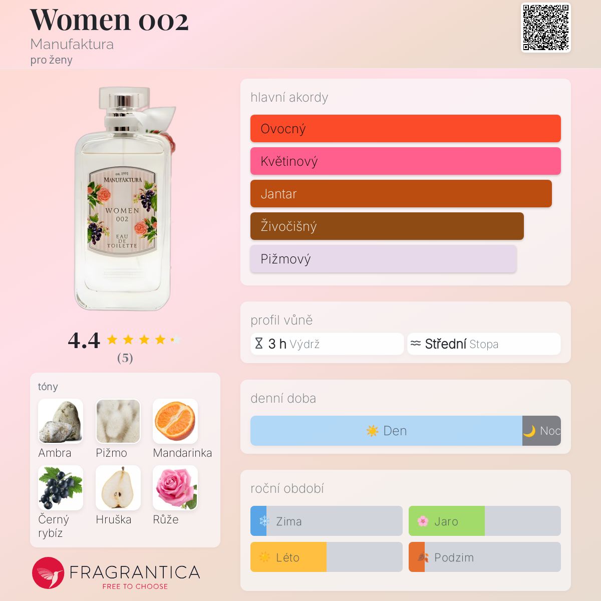 Women 002 podle Manufaktura je Floral Fruity vůně pro ženy. Vrchní tóny jsou Mandarinka, Černý rybíz, Hruška a Ananas; střední tóny jsouRůže, Jasmín a Frézie ; základní tóny jsou Ambra, Pižmo a Santalové dřevo.