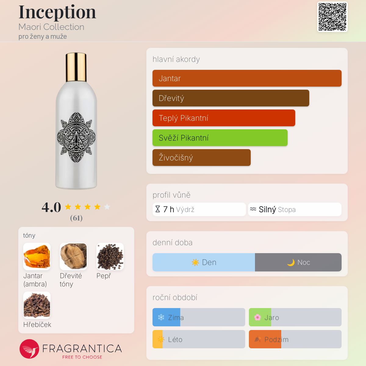 Inception podle Maori Collection je Woody Spicy vůně pro ženy a muže. Inception byl/a uveden/a v roce 2017. "Nosem" za touto vůní je Paolo Terenzi.