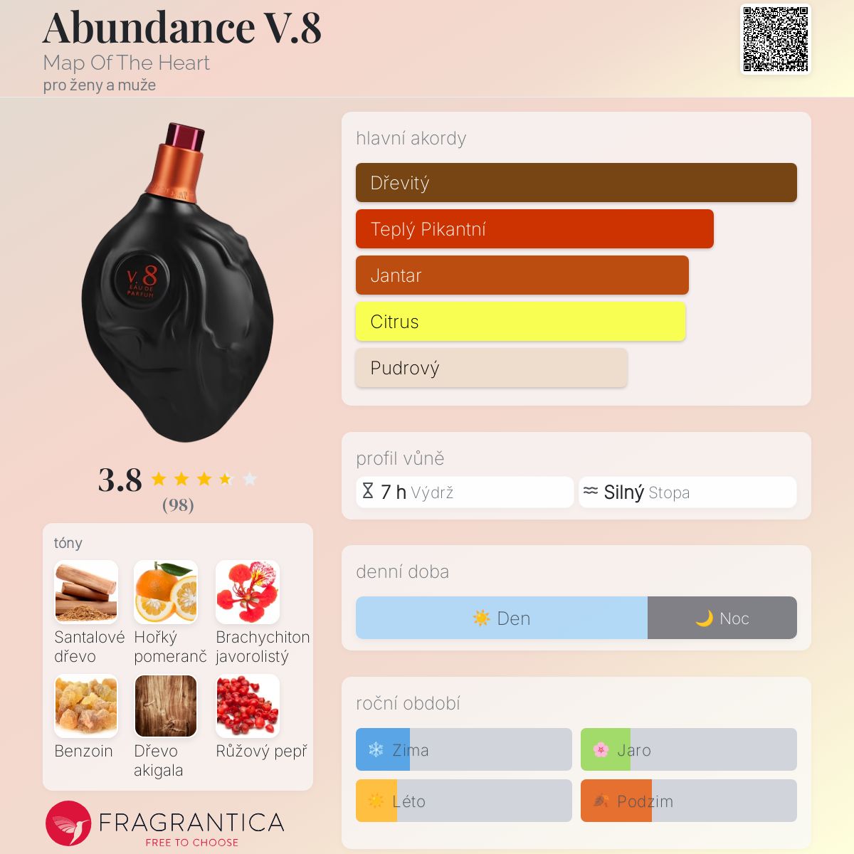 Abundance V.8 podle Map Of The Heart je Woody Spicy vůně pro ženy a muže. Abundance V.8 byl/a uveden/a v roce 2023. Abundance V.8 byl/a vytvořen/a Jacques Huclier a Amelie Jacquin. Vrchní tóny jsou Hořký pomeranč, Růžový pepř a Kadidlo; střední tón jeBrachychiton javorolistý ; základní tóny jsou Australské santalové dřevo, Bílé santalové dřevo, Benzoin a Dřevo akigala.