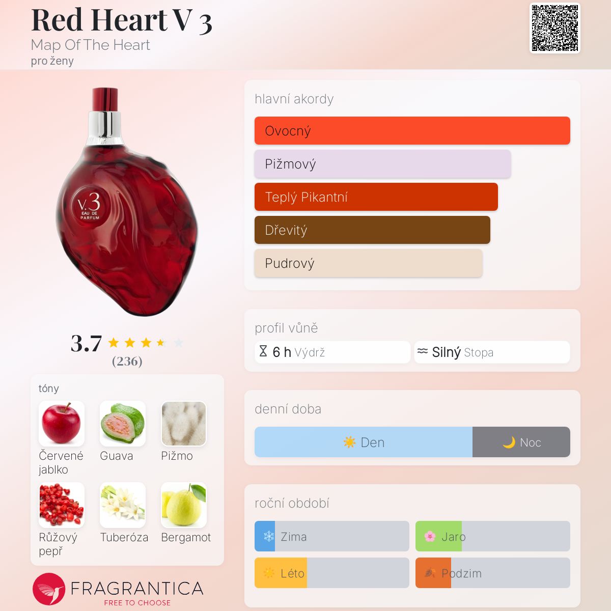 Red Heart V 3 podle Map Of The Heart je Floral Fruity vůně pro ženy. Red Heart V 3 byl/a uveden/a v roce 2014. "Nosem" za touto vůní je Jacques Huclier. Vrchní tóny jsou Červené jablko, Růžový pepř a Bergamot; střední tóny jsouGuava, Tuberóza, Skořice a Olibanum ; základní tóny jsou Pižmo, Pačuli, Santalové dřevo a Vanilka.