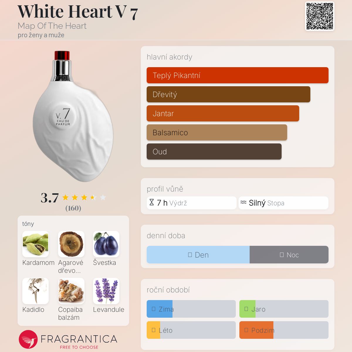 White Heart V 7 podle Map Of The Heart je Orientální Woody vůně pro ženy a muže. White Heart V 7 byl/a uveden/a v roce 2018. White Heart V 7 byl/a vytvořen/a Jacques Huclier a Nisrine Bouazzaoui Grillié. Vrchní tóny jsou Kardamom, Levandule a Aldehydy; střední tóny jsouŠvestka, Kadidlo, Gardénie a Labdanum ; základní tóny jsou Agarové dřevo (oud), Copaiba balzám, Santalové dřevo, Cypriolový olej a Vetiver.