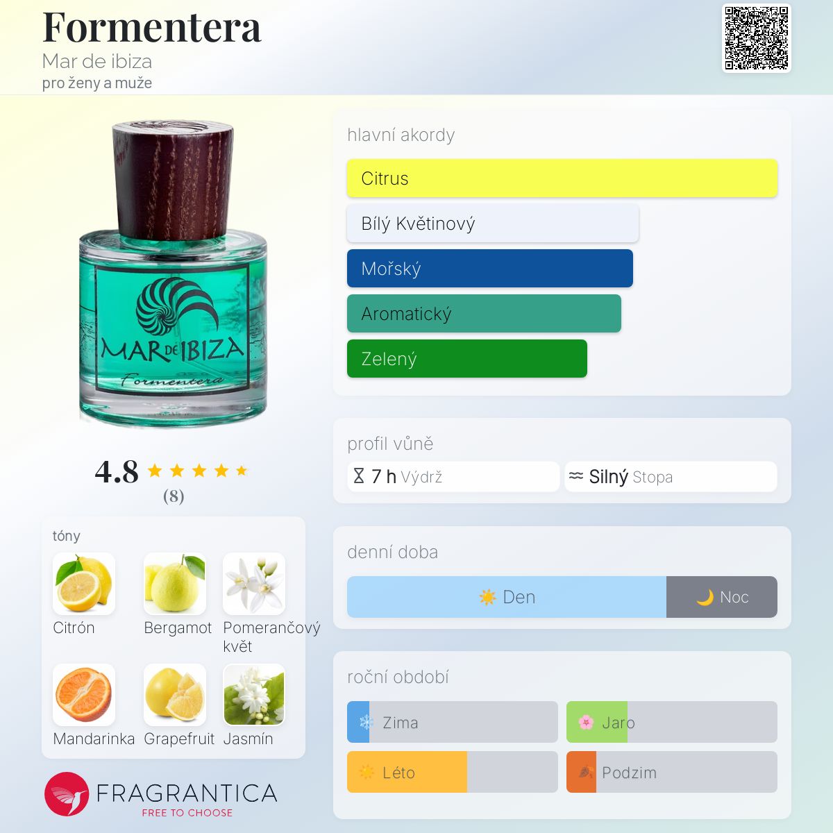 Formentera podle Mar de ibiza je Citrusová vůně pro ženy a muže. Formentera byl/a uveden/a v roce 2018. Vrchní tóny jsou Citrón, Bergamot, Pomerančový květ, Mandarinka a Grapefruit; střední tóny jsouJasmín, Růže, Pižmo, Bylinné tóny a Mořská řasa ; základní tóny jsou Jantar (ambra), Exotická dřeva, Bílé pižmo a Mořské tóny.