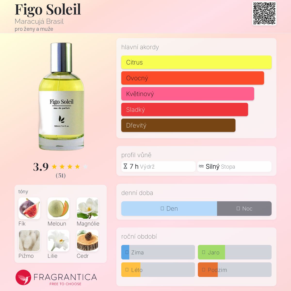 Figo Soleil podle Maracujá Brasil je Floral Fruity vůně pro ženy a muže. Figo Soleil byl/a uveden/a v roce 2021. "Nosem" za touto vůní je Symrise. Vrchní tóny jsou Fík, Meloun, Grapefruit, Bergamot a Mandarinka; střední tóny jsouMagnólie, Lilie, Orchidej, Koriandr, Kardamom a Růže ; základní tóny jsou Pižmo, Cedr a Jantar (ambra).