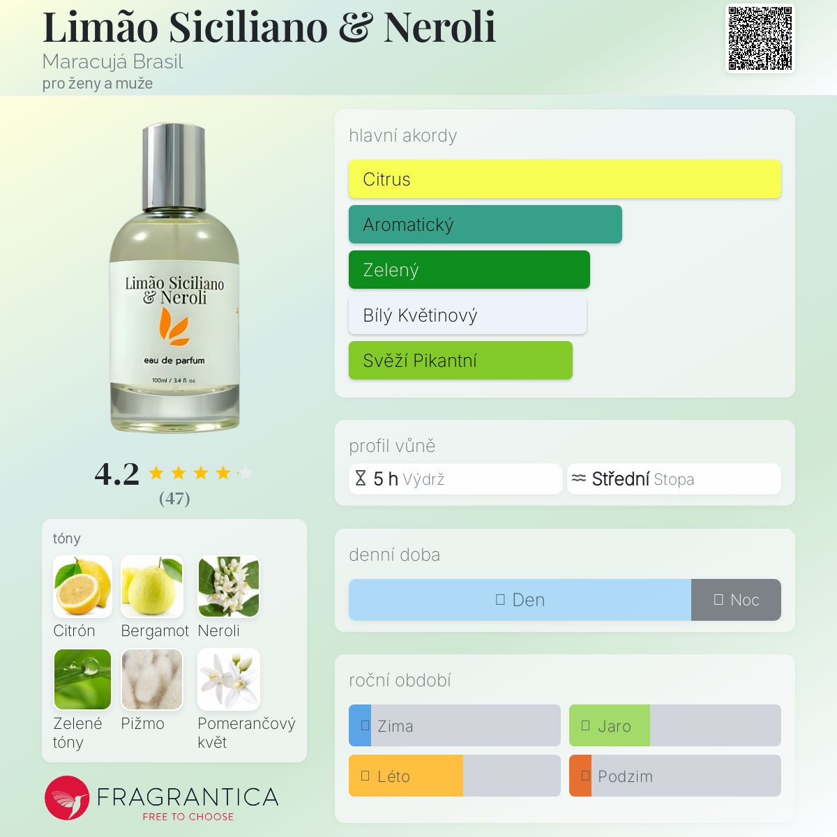 Limão Siciliano & Neroli podle Maracujá Brasil je Citrus vůně pro ženy a muže. Limão Siciliano & Neroli byl/a uveden/a v roce 2019. Vrchní tóny jsou Sicilský citron, Citronová kůra, Bergamot, Zelené listí, Mandarinka a Absint; střední tóny jsouNeroli, Pomerančový květ, Liči, Bourbonské geránium , Magnólie a Frézie ; základní tóny jsou Pižmo, Vetiver, Kosatec, Jantar (ambra) a Pačuli.