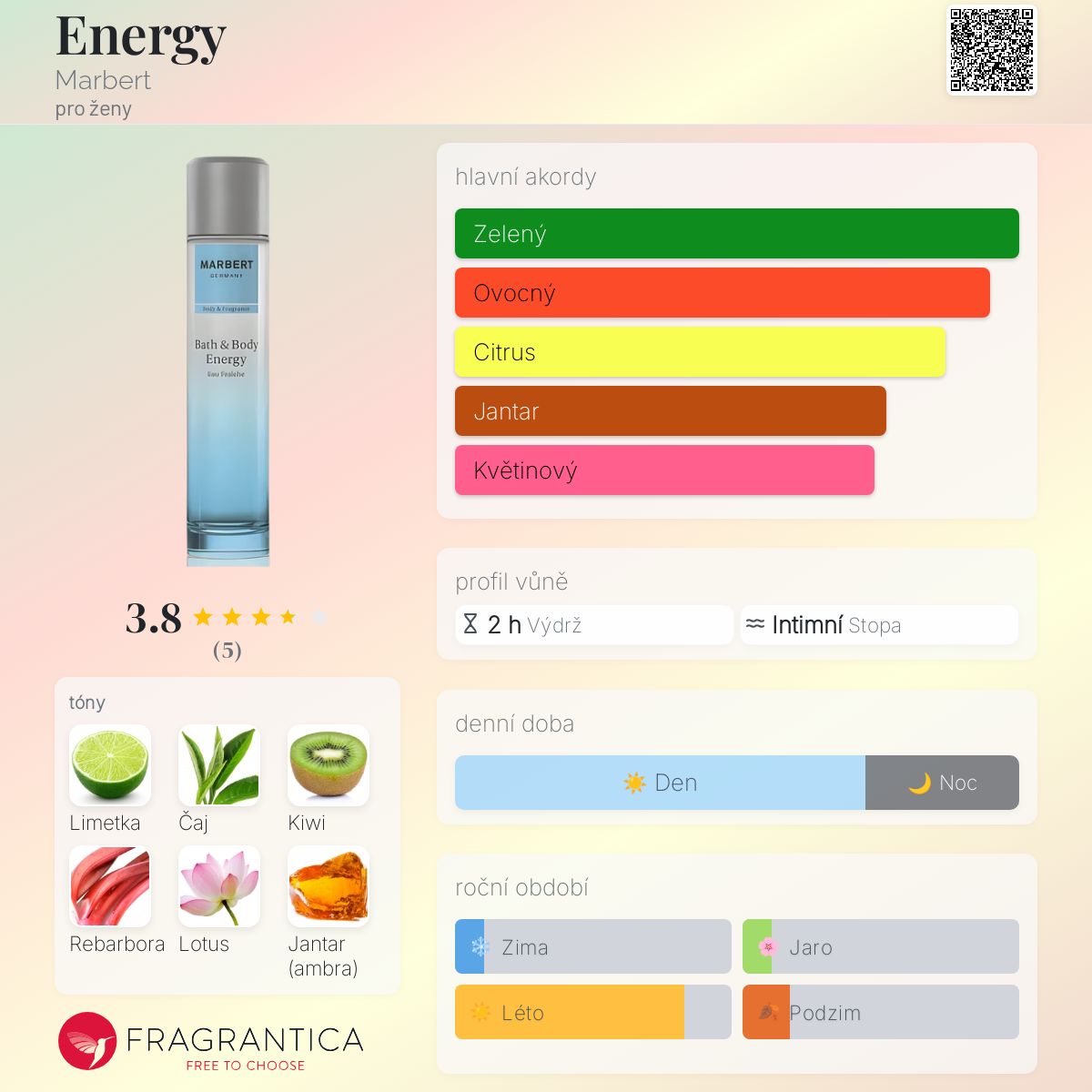 Energy podle Marbert je Floral Green vůně pro ženy. Energy byl/a uveden/a v roce 2010. Vrchní tóny jsou Limetka, Čaj, Kiwi a Rebarbora; střední tóny jsouLotus a Jasmín ; základní tóny jsou Jantar (ambra) a Pačuli.