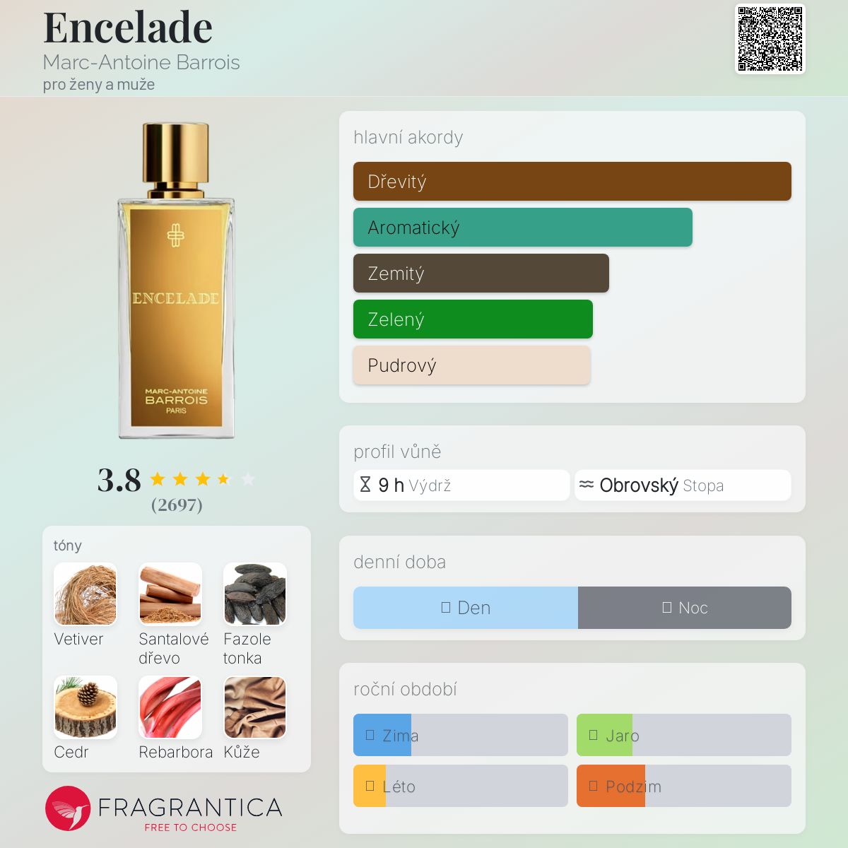 Encelade podle Marc-Antoine Barrois je Aromatic Green vůně pro ženy a muže. Encelade byl/a uveden/a v roce 2022. "Nosem" za touto vůní je Quentin Bisch. Vrchní tón je Rebarbora ; střední tón jeCedr ; základní tóny jsou Vetiver, Santalové dřevo, Fazole tonka a Kůže.