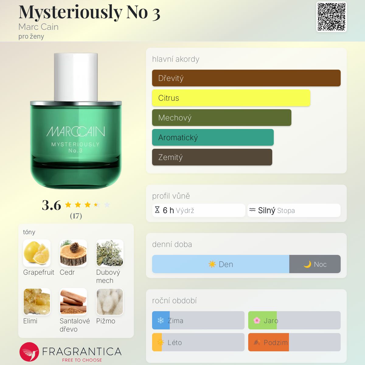 Mysteriously No 3 podle Marc Cain je Orientální Woody vůně pro ženy. Mysteriously No 3 byl/a uveden/a v roce 2017. Mysteriously No 3 byl/a vytvořen/a Corinne Cachen, Michel Almairac a Maarten Schoute. Vrchní tóny jsou Grapefruit, Pryskyřice elemi a Kadidlo; střední tóny jsouCedr, Mech a Santalové dřevo ; základní tóny jsou Pižmo, Vanilka a Fazole tonka.