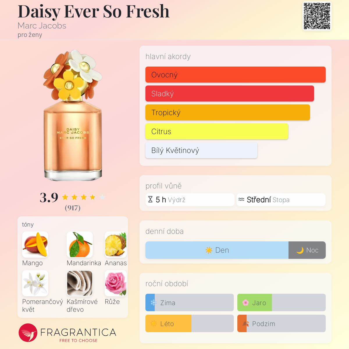 Daisy Ever So Fresh podle Marc Jacobs je Floral vůně pro ženy. Toto je nová vůně. Daisy Ever So Fresh byl/a uveden/a v roce 2022. Vrchní tóny jsou Mango, Mandarinka a Ananas; střední tóny jsouPomerančový květ a Růžová voda ; základní tón je Kašmírové dřevo.