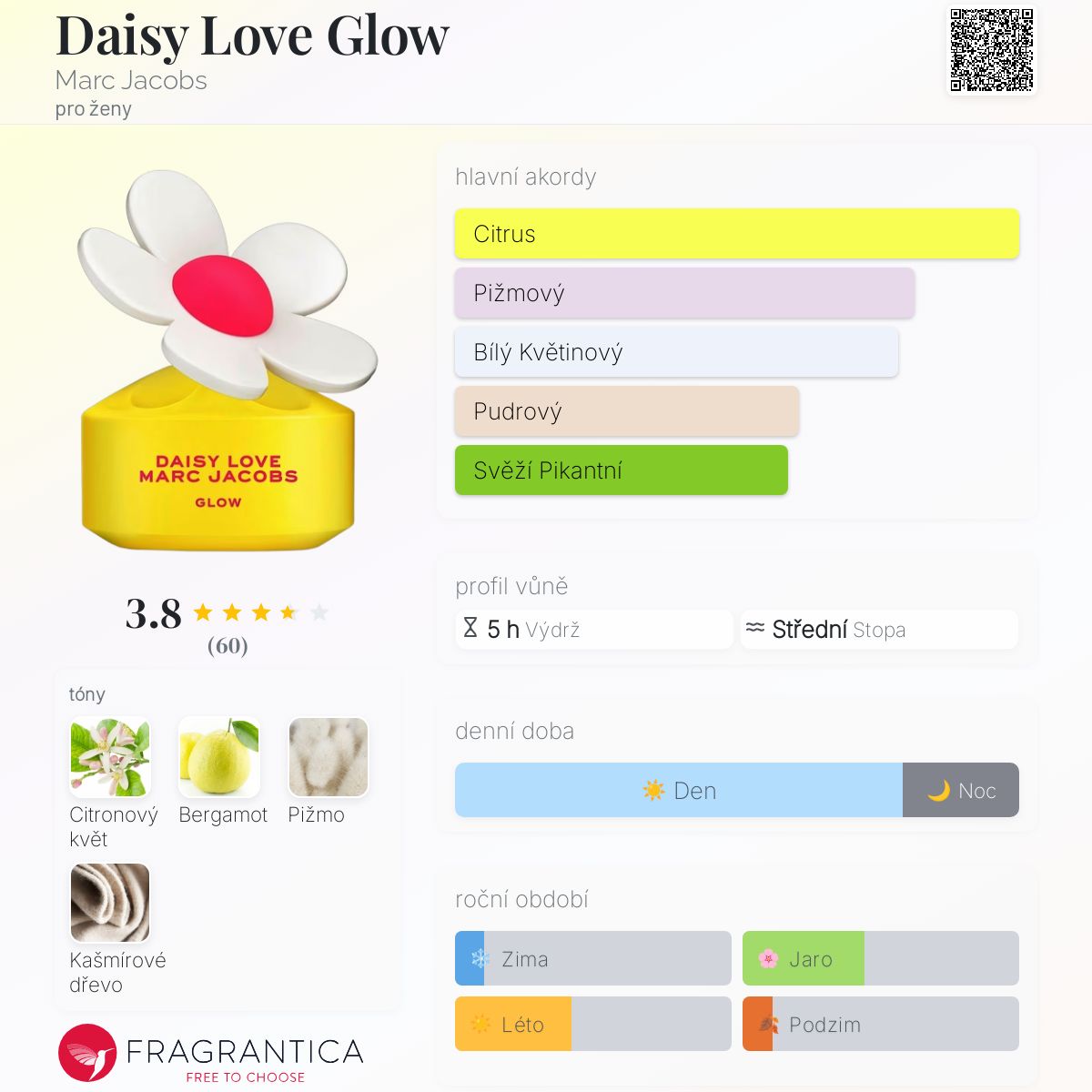 Daisy Love Glow podle Marc Jacobs je Floral Woody Musk vůně pro ženy. Toto je nová vůně. Daisy Love Glow byl/a uveden/a v roce 2024. Vrchní tón je Bergamot ; střední tón jeCitronový květ ; základní tóny jsou Pižmo a Kašmírové dřevo.