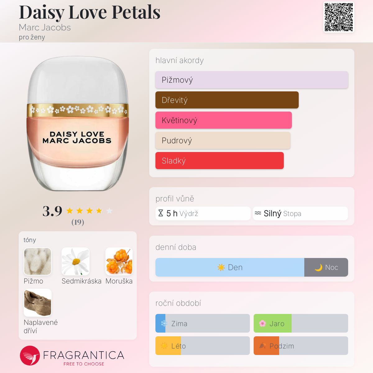 Daisy Love Petals podle Marc Jacobs je Floral Woody Musk vůně pro ženy. Daisy Love Petals byl/a uveden/a v roce 2020. "Nosem" za touto vůní je Alberto Morillas. Vrchní tón je Moruška ; střední tón jeSedmikráska ; základní tóny jsou Kašmírové pižmo a Naplavené dříví.