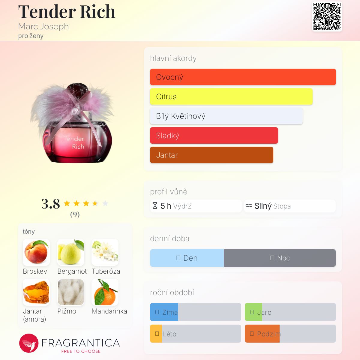 Tender Rich podle Marc Joseph je Floral Fruity vůně pro ženy. Vrchní tóny jsou Bergamot, Mandarinka, Velká jahoda a Jablko; střední tóny jsouTuberóza a Jasmín ; základní tóny jsou Broskev, Jantar (ambra) a Bílé pižmo.