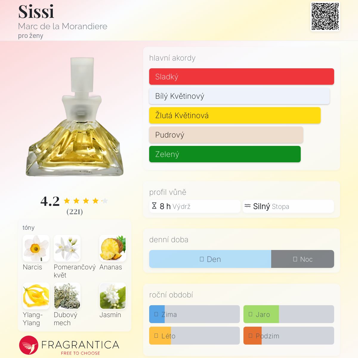 Sissi podle Marc de la Morandiere je Chypre Floral vůně pro ženy. Sissi byl/a uveden/a v roce 1992. Vrchní tóny jsou Pomerančový květ, Ananas, Madagarská kananga, Galbanum, Měsíček a Kořeněné tóny; střední tóny jsouNarcis, Jasmín, Kosatec, Fialka, Konvalinka a Růže ; základní tóny jsou Dubový mech, Broskev, Pižmo, Santalové dřevo, Vetiver, Vanilka, Orris, Jantar (ambra) a Maliny.