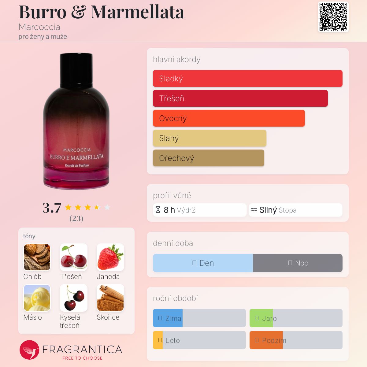 Burro & Marmellata podle Marcoccia je Floral Fruity Gourmand vůně pro ženy a muže. Toto je nová vůně. Burro & Marmellata byl/a uveden/a v roce 2025. "Nosem" za touto vůní je Lorenzo Berti. Vrchní tóny jsou Chléb a Máslo; střední tóny jsouTřešeň, Jahoda, Kyselá třešeň a Skořice ; základní tóny jsou Cukr, Santalové dřevo, Vetiver a Vanilka.
