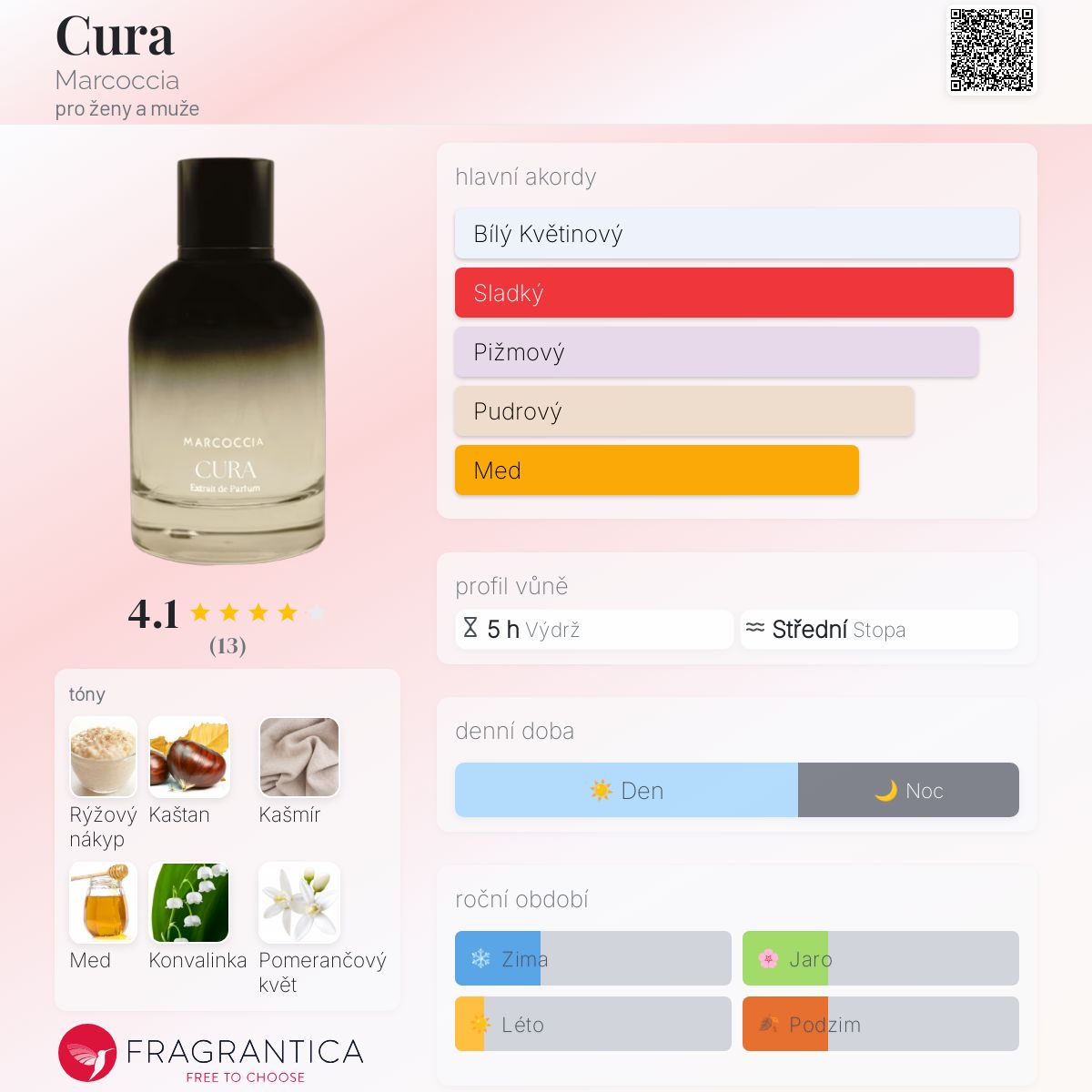 Cura podle Marcoccia je vůně pro ženy a muže. Toto je nová vůně. Cura byl/a uveden/a v roce 2025. Vrchní tóny jsou Kaštan, Med a Skořice; střední tóny jsouRýžový nákyp, Konvalinka a Pomerančový květ ; základní tóny jsou Kašmír, Bílé pižmo a Vanilka.