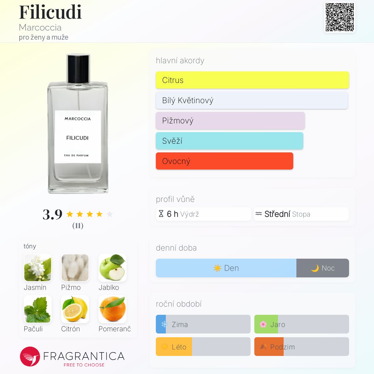 Filicudi podle Marcoccia je Orientální Floral vůně pro ženy a muže. Filicudi byl/a uveden/a v roce 2023. "Nosem" za touto vůní je Andrea Marcoccia. Vrchní tóny jsou Zelené jablko, Citrón, Pomeranč, Konvalinka, Grapefruit a Maliny; střední tóny jsouJasmín, Pačuli, Vanilkový lusk a Kosatec ; základní tóny jsou Bílé pižmo, Jantar (ambra) a Vanilkový lusk.