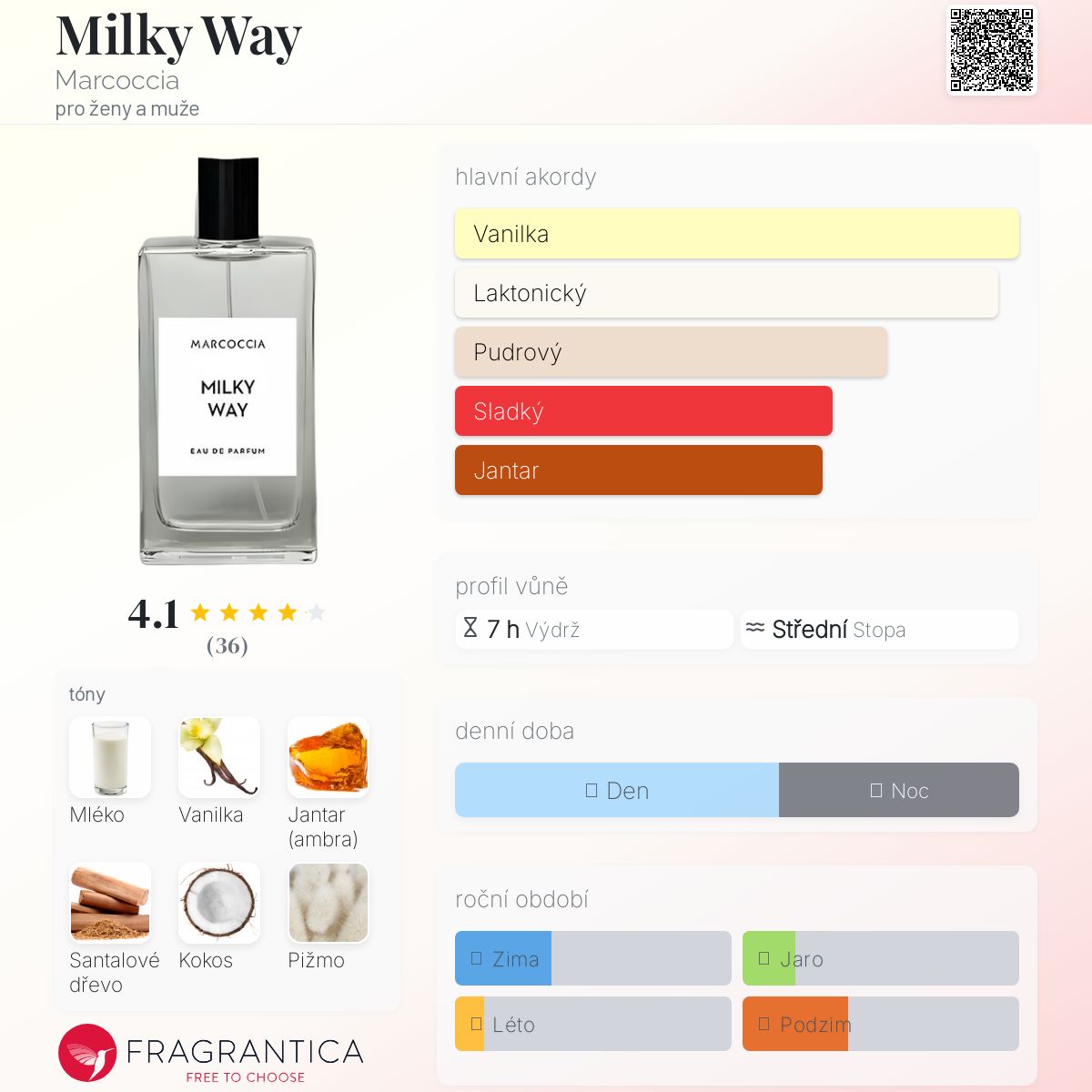 Milky Way podle Marcoccia je Floral Fruity Gourmand vůně pro ženy a muže. Toto je nová vůně. Milky Way byl/a uveden/a v roce 2024. Vrchní tóny jsou Růžový pepř, Bergamot a Citrón; střední tóny jsouMléko, Kokos, Orchidej a Jasmín ; základní tóny jsou Vanilka, Jantar (ambra), Santalové dřevo a Bílé pižmo.