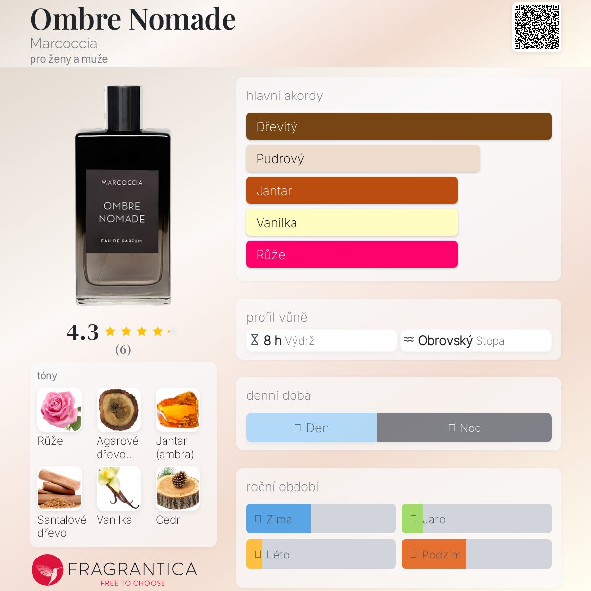 Ombre Nomade podle Marcoccia je Woody Spicy vůně pro ženy a muže. Ombre Nomade byl/a uveden/a v roce 2023. "Nosem" za touto vůní je Andrea Marcoccia. Vrchní tóny jsou Růže, Agarové dřevo (oud), Jantar (ambra), Santalové dřevo, Neroli a Jasmín; střední tóny jsouRůže, Agarové dřevo (oud), Santalové dřevo, Cedr, Pačuli, Citrón a Jasmín ; základní tóny jsou Vanilka, Agarové dřevo (oud) a Pižmo.