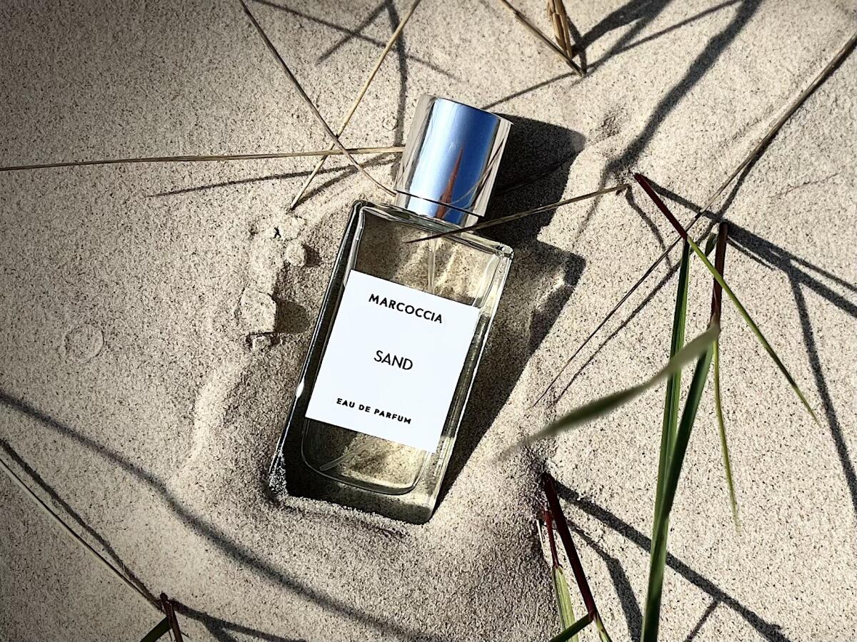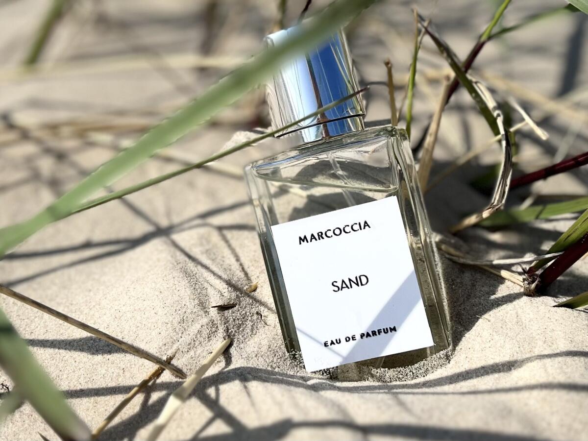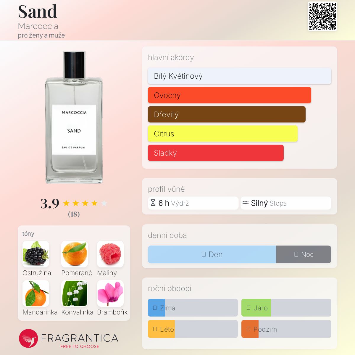 Sand podle Marcoccia je Floral vůně pro ženy a muže. Sand byl/a uveden/a v roce 2023. "Nosem" za touto vůní je Andrea Marcoccia. Vrchní tóny jsou Ostružina, Pomeranč, Maliny, Mandarinka, Konvalinka a Brambořík; střední tóny jsouRůže, Jantar (ambra), Gardénie a Jasmín ; základní tóny jsou Vanilka, Dřevité tóny, Cedr a Mech.