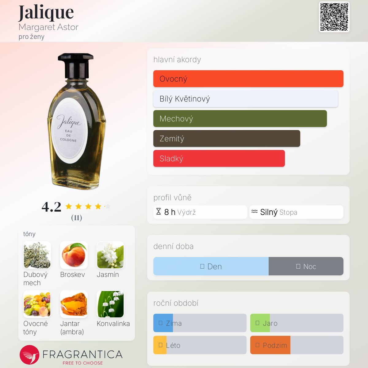 Jalique podle Margaret Astor je Floral vůně pro ženy. Jalique byl/a uveden/a v roce 1975. Vrchní tóny jsou Bílá broskev, Jasmín, Ovocné tóny a Zelené tóny; střední tóny jsouKonvalinka, Růže, Hyacint a Tuberóza ; základní tóny jsou Dubový mech, Jantar (ambra) a Pižmo.