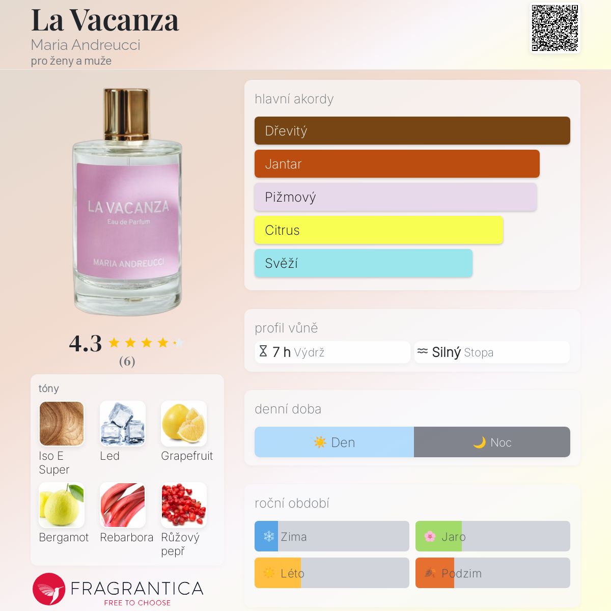 La Vacanza podle Maria Andreucci je vůně pro ženy a muže. Toto je nová vůně. La Vacanza byl/a uveden/a v roce 2024. "Nosem" za touto vůní je Luca Maffei. Vrchní tóny jsou Růžový grapefruit a Bergamot; střední tóny jsouLed, Rebarbora a Růžový pepř ; základní tóny jsou Iso E Super a Bílý jantar (ambra).