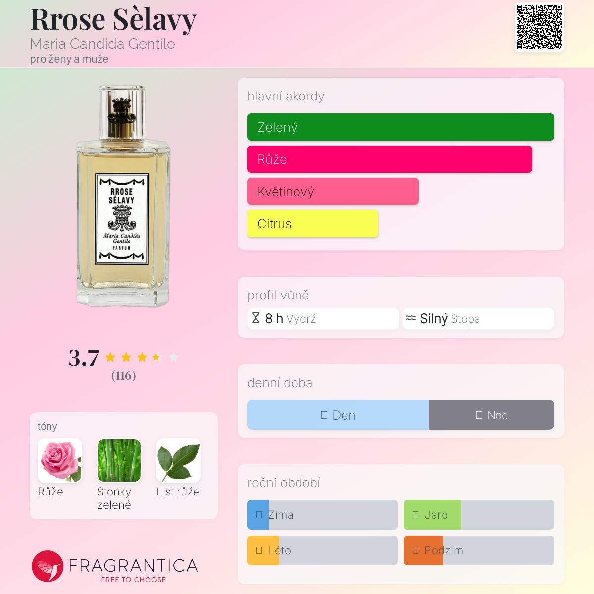 Rrose Sèlavy podle Maria Candida Gentile je Floral vůně pro ženy a muže. Rrose Sèlavy byl/a uveden/a v roce 2016. "Nosem" za touto vůní je Maria Candida Gentile. Vrchní tóny jsou Turecká růže, Květná růže a Čajová růže; střední tón jeRůže ; základní tóny jsou Stonky zelené a List růže.