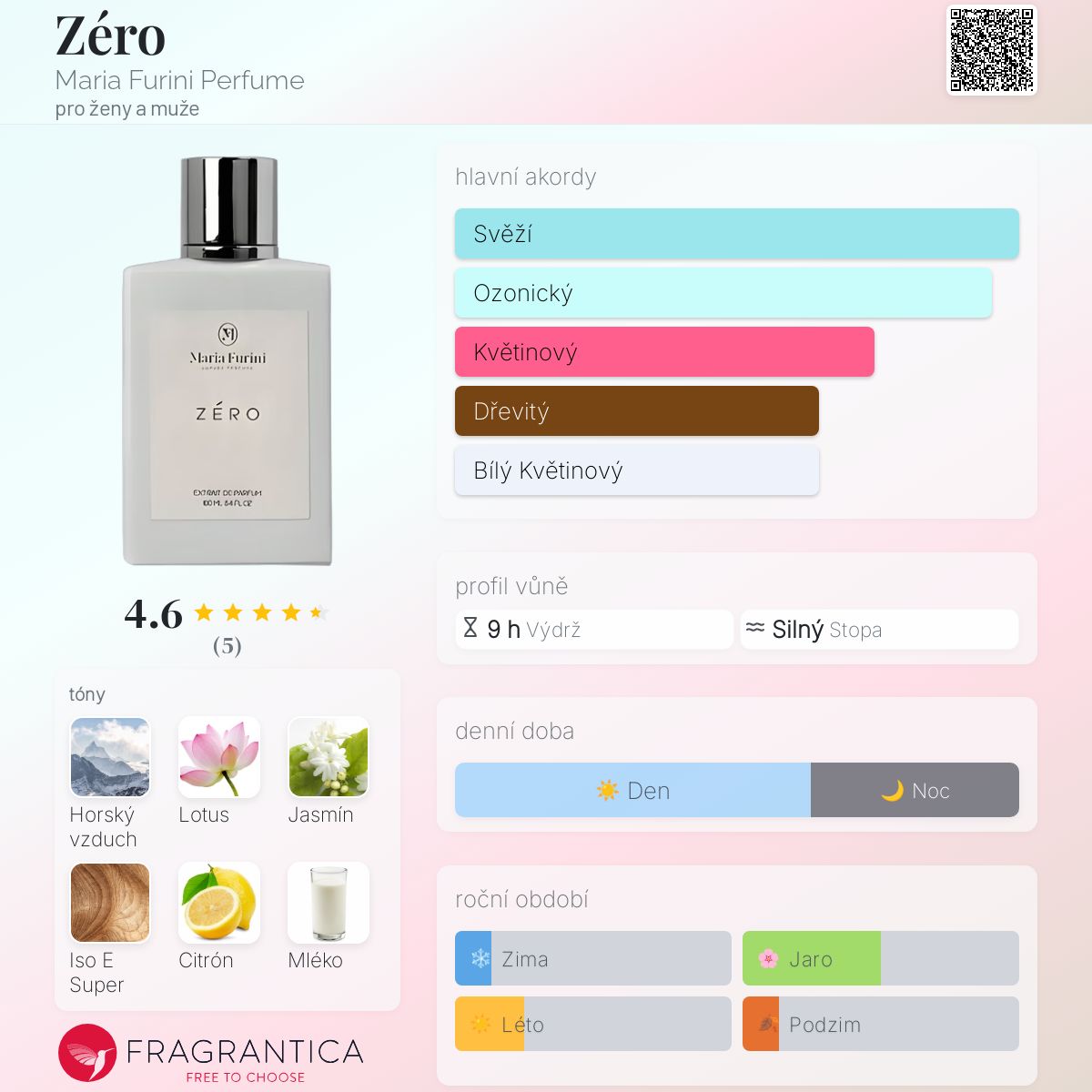 Zéro podle Maria Furini Perfume je Orientální Floral vůně pro ženy a muže. Toto je nová vůně. Zéro byl/a uveden/a v roce 2025. "Nosem" za touto vůní je Maria Furini. Vrchní tóny jsou Horský vzduch, Citrón a Mléko; střední tóny jsouLotus, Jasmín a Vanilka ; základní tóny jsou Iso E Super, Bílý jantar (ambra) a Cedr.