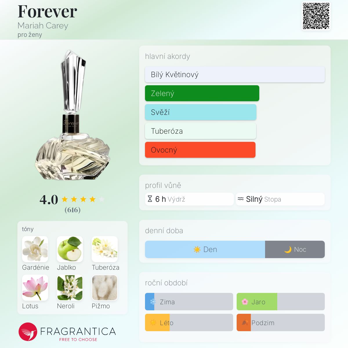 Forever podle Mariah Carey je Floral vůně pro ženy. Forever byl/a uveden/a v roce 2009. "Nosem" za touto vůní je Olivier Gillotin. Vrchní tóny jsou Granny Smith jablko, Lotus a Neroli; střední tóny jsouGardénie, Tuberóza a Konvalinka ; základní tóny jsou Bílé pižmo, Santalové dřevo a Pačuli.