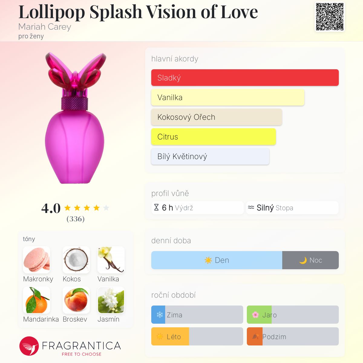 Lollipop Splash Vision of Love podle Mariah Carey je Floral Fruity vůně pro ženy. Lollipop Splash Vision of Love byl/a uveden/a v roce 2011. Vrchní tóny jsou Kokos, Mandarinka a Neroli; střední tóny jsouMakronky, Broskev a Jasmín ; základní tóny jsou Vanilka, Santalové dřevo a Pižmo.
