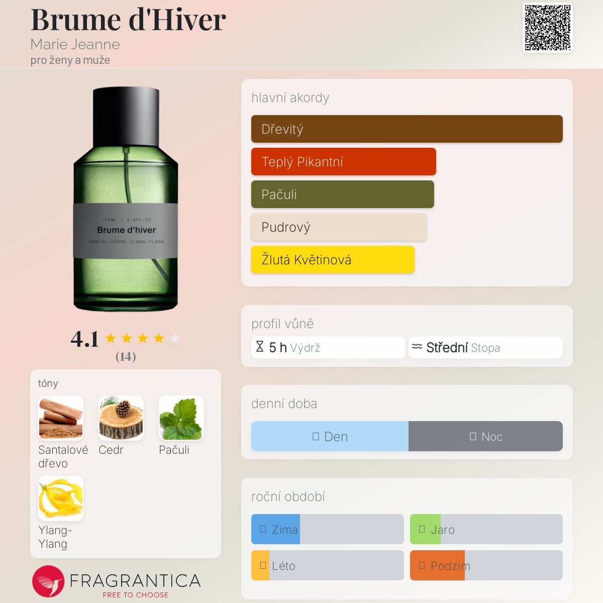 Brume d'Hiver podle Marie Jeanne je Woody vůně pro ženy a muže. Brume d'Hiver byl/a uveden/a v roce 2022. "Nosem" za touto vůní je Sidonie Lancesseur.