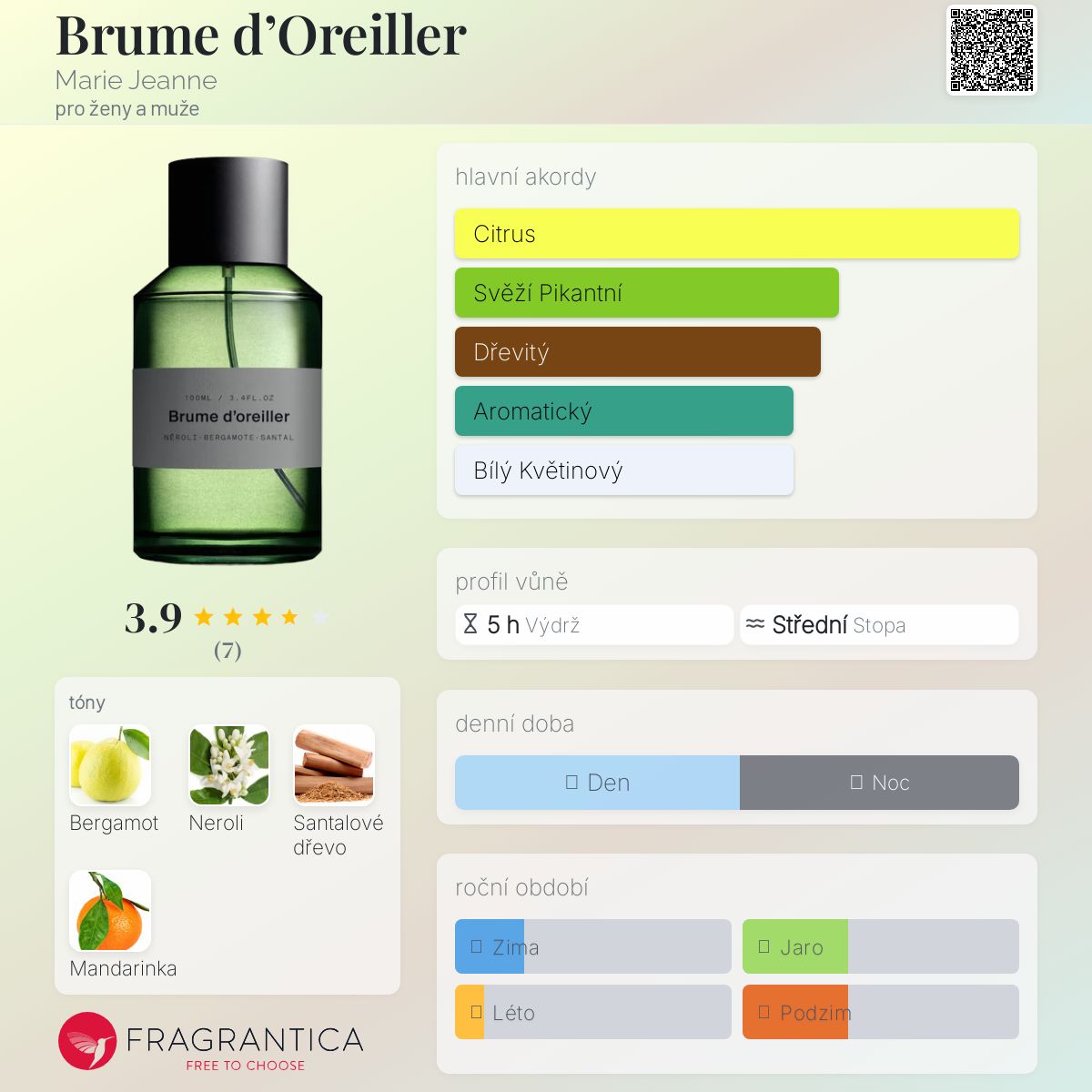 Brume d’Oreiller podle Marie Jeanne je Woody Aromatic vůně pro ženy a muže. Brume d’Oreiller byl/a uveden/a v roce 2020. "Nosem" za touto vůní je Sidonie Lancesseur.