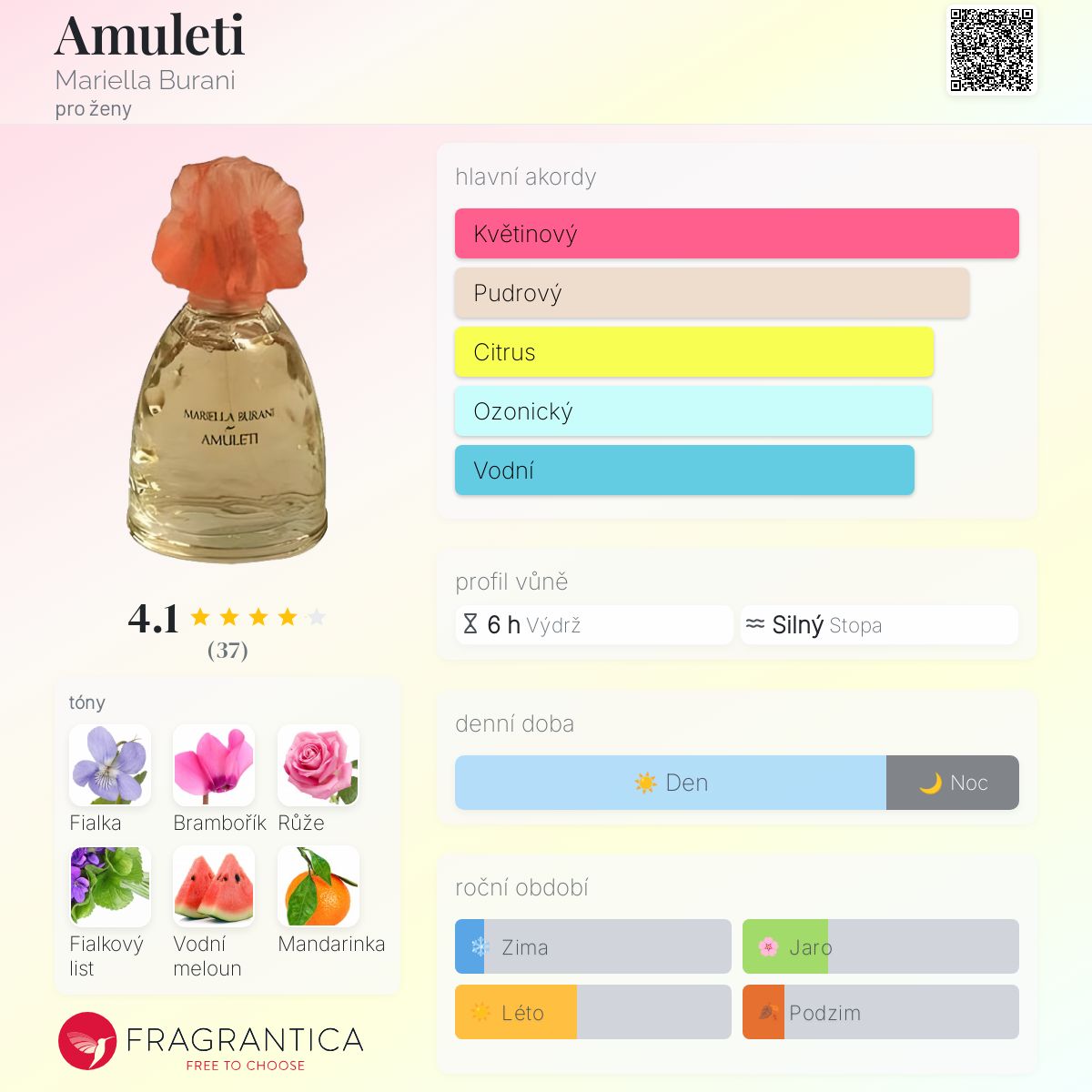 Amuleti podle Mariella Burani je Floral vůně pro ženy. Amuleti byl/a uveden/a v roce 1999. "Nosem" za touto vůní je Jean Jacques. Vrchní tóny jsou Fialkový list, Vodní meloun, Italská mandarinka a Grapefruit; střední tóny jsouFialka, Brambořík, Bílá růže, Vodní jasmín, Frézie, Kosatec, Ananas a Mango ; základní tóny jsou Pižmo a Santalové dřevo.