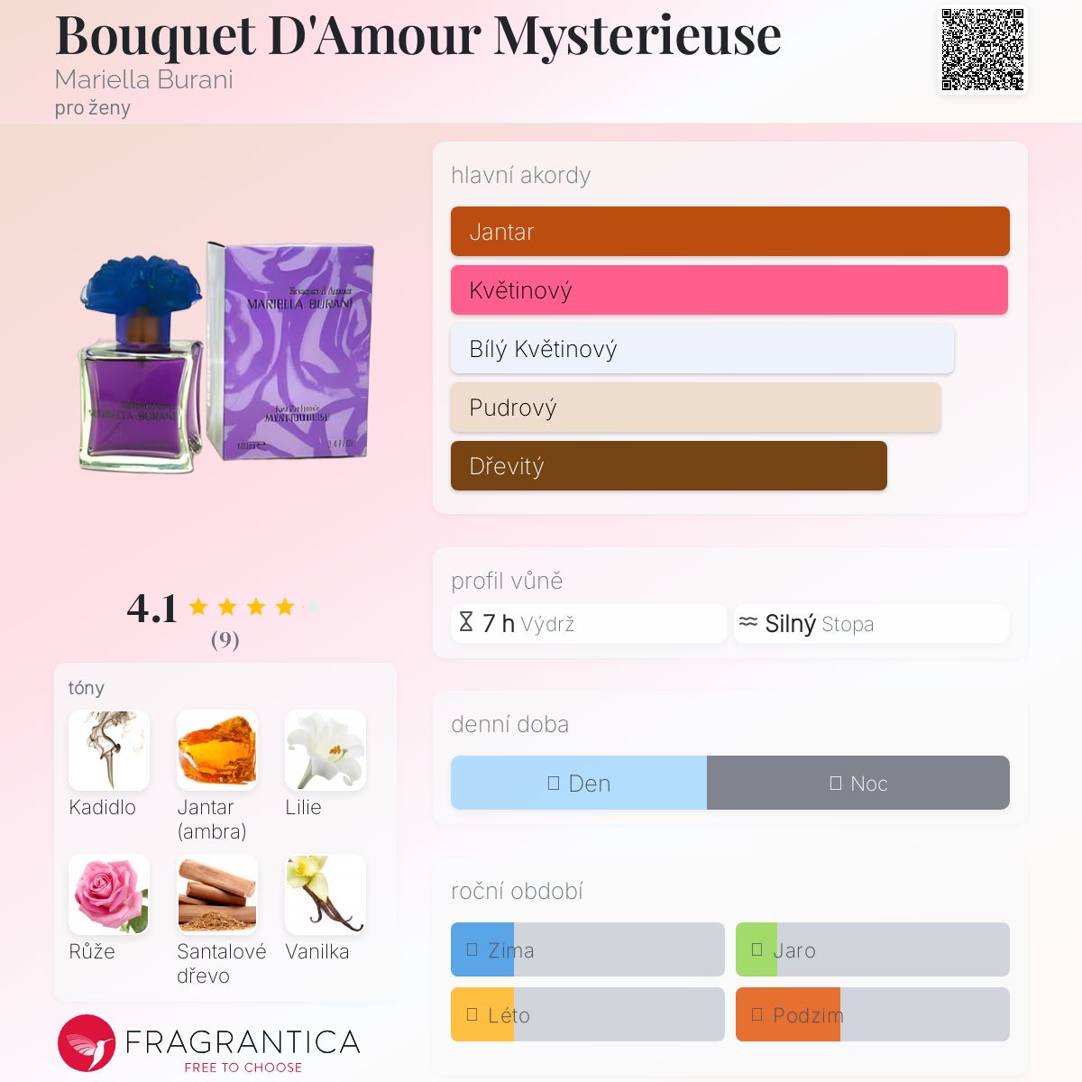 Bouquet D'Amour Mysterieuse podle Mariella Burani je Orientální Floral vůně pro ženy. Bouquet D'Amour Mysterieuse byl/a uveden/a v roce 2002. Vrchní tóny jsou Lilie, Fialkový list, Bergamot a Černý rybíz; střední tóny jsouRůže, Jasmín, Hloh, Broskev, Magnólie a Otočník ; základní tóny jsou Kadidlo, Jantar (ambra), Santalové dřevo, Vanilka a Pižmo.