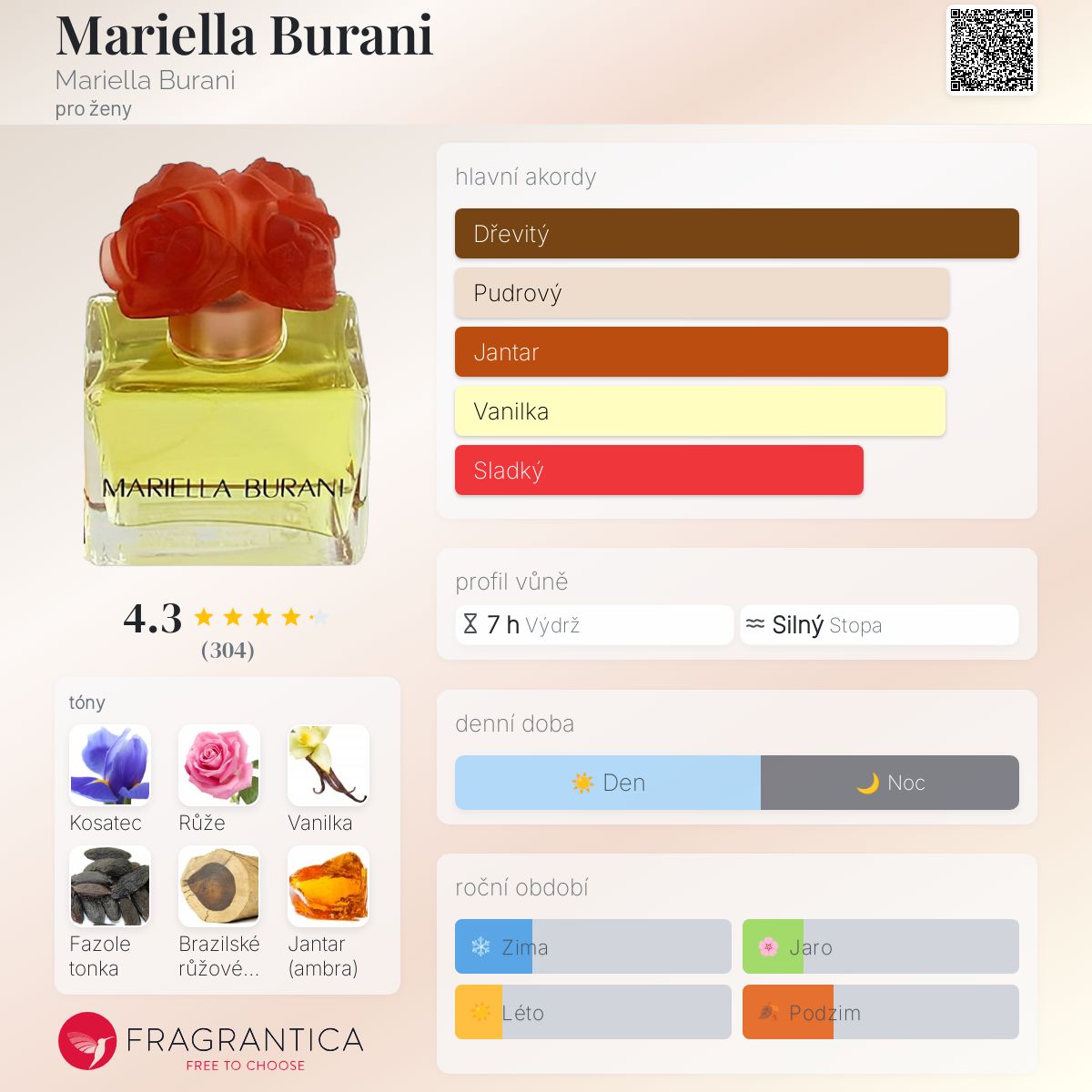 Mariella Burani podle Mariella Burani je Orientální vůně pro ženy. Mariella Burani byl/a uveden/a v roce 1993. Vrchní tóny jsou Brazilské růžové dřevo, Estragon, Bergamot a Citrón; střední tóny jsouKosatec, Růže, Ylang-Ylang, Jasmín a Konvalinka ; základní tóny jsou Vanilka, Fazole tonka, Jantar (ambra), Santalové dřevo, Pižmo, Benzoin, Pačuli a Vetiver.