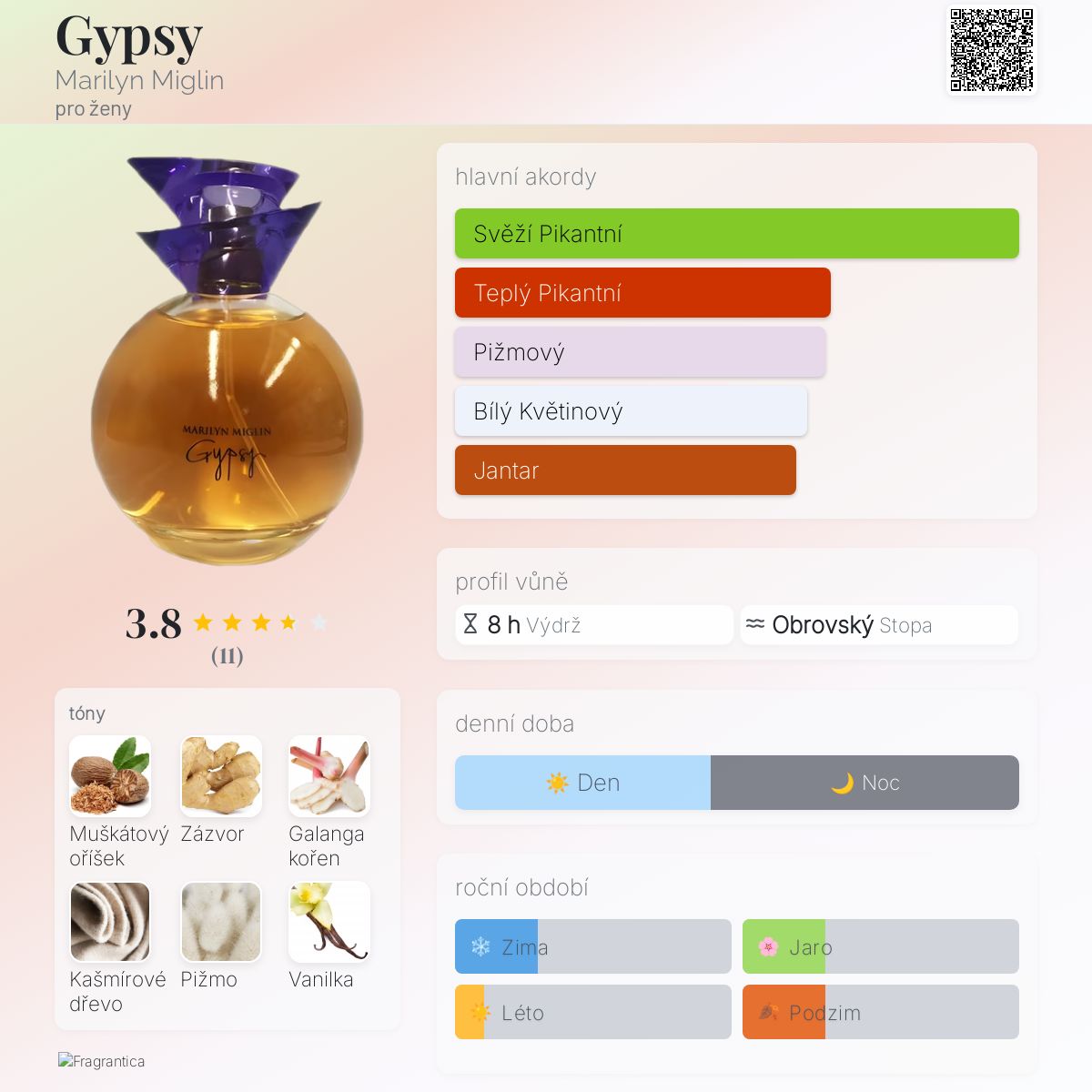 Gypsy podle Marilyn Miglin je Floral Woody Musk vůně pro ženy. Vrchní tóny jsou Muškátový oříšek, Zázvor, Galanga kořen a Bergamot; střední tóny jsouJasmín Sambac, Zimolez, Bílá orchidej a Květ tiare ; základní tóny jsou Kašmírové dřevo, Pižmo, Vanilka a Benzoin.