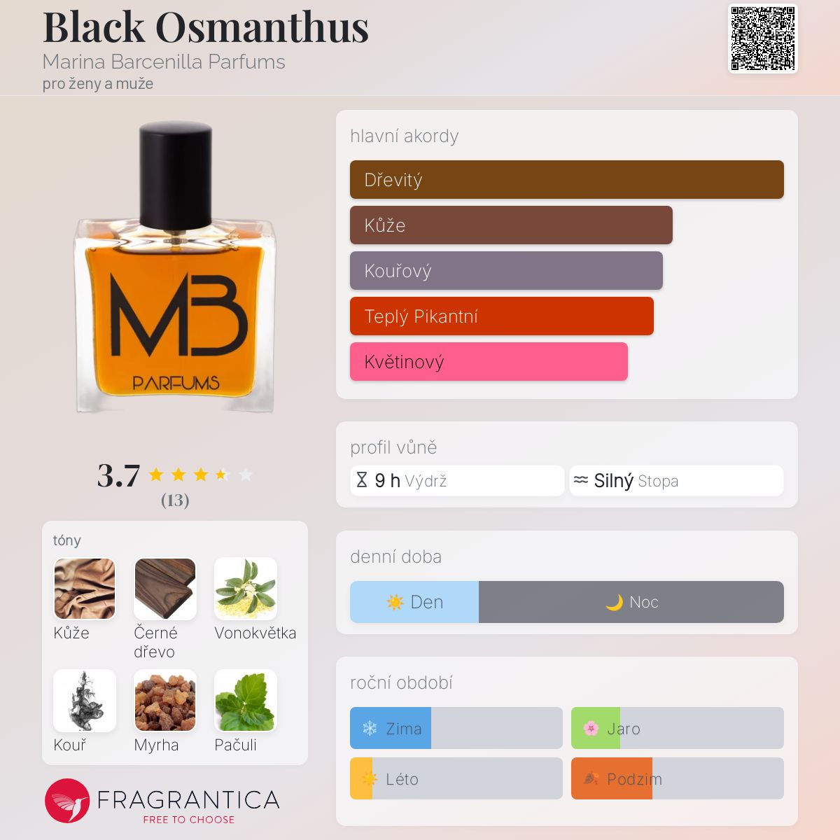 Black Osmanthus podle Marina Barcenilla Parfums je Orientální Floral vůně pro ženy a muže. Black Osmanthus byl/a uveden/a v roce 2017. "Nosem" za touto vůní je Marina Barcenilla. Tento parfém je vítězem oceněníBest New Independent Fragrance FiFi Award of Perfume Extraordinaire at the 2017 UK Awards .