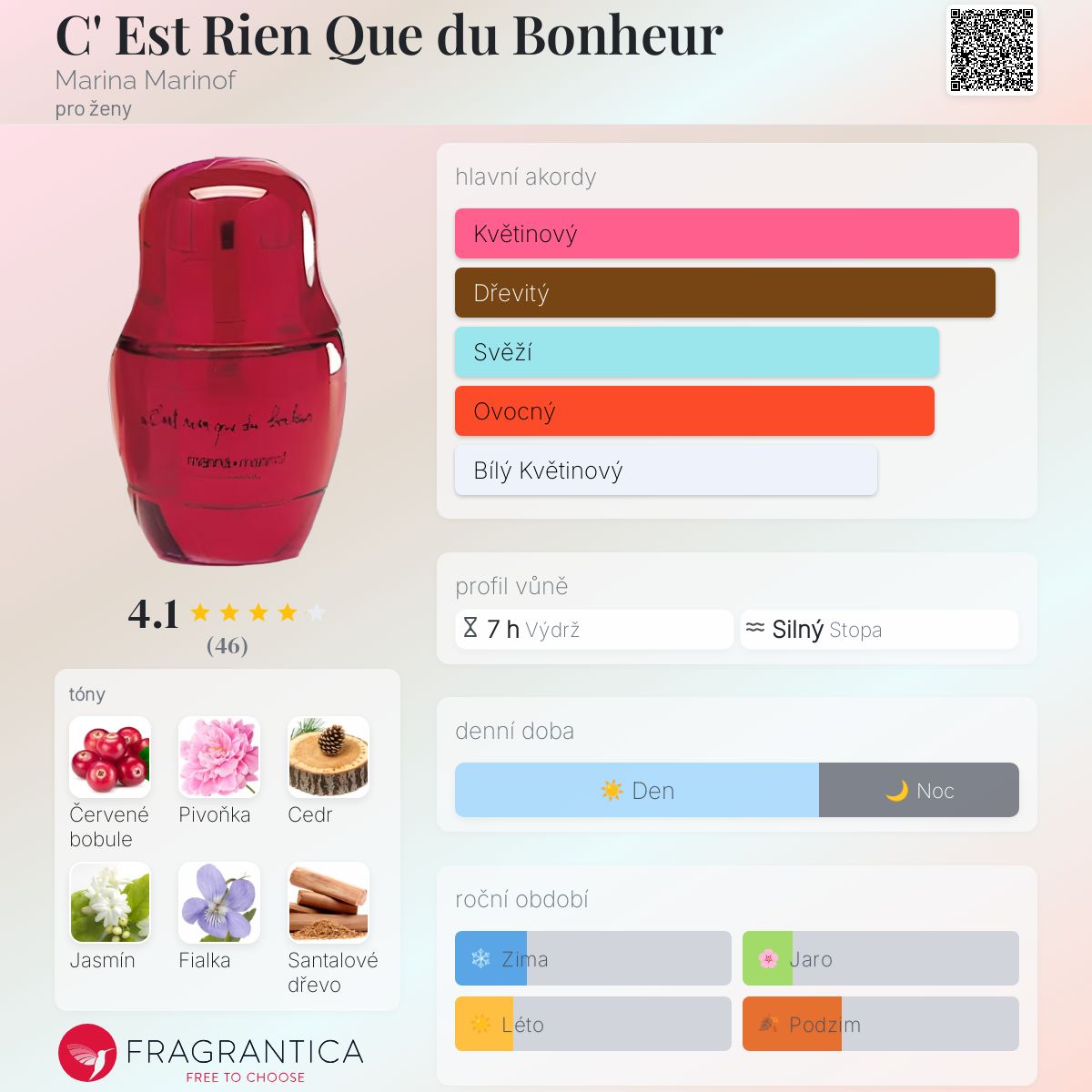 C' Est Rien Que du Bonheur podle Marina Marinof je Floral vůně pro ženy. C' Est Rien Que du Bonheur byl/a uveden/a v roce 2001. Vrchní tóny jsou Červené bobule, Jasmín, Fialka a Lilie; střední tóny jsouPivoňka, Magnólie a Frézie ; základní tóny jsou Cedr, Santalové dřevo, Vetiver a Pižmo.