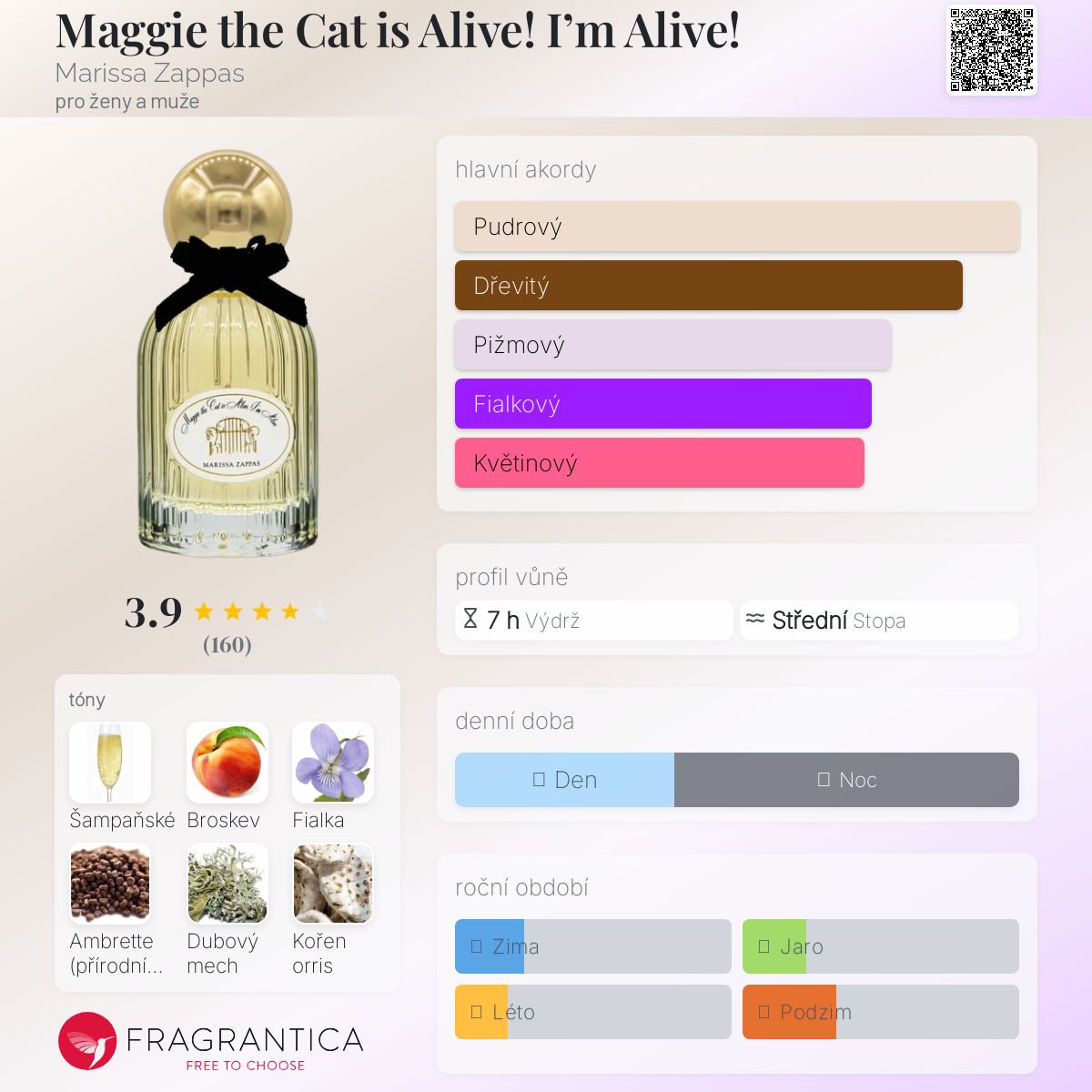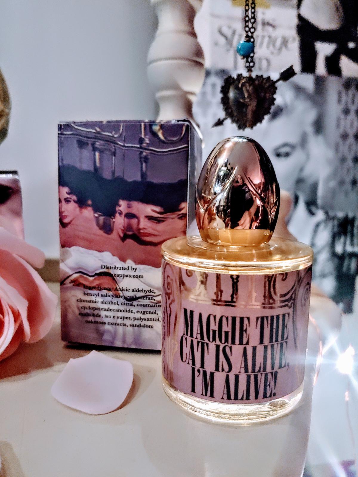 Maggie the Cat is Alive! I’m Alive! podle Marissa Zappas je vůně pro ženy a muže. Maggie the Cat is Alive! I’m Alive! byl/a uveden/a v roce 2023. Vrchní tóny jsou Šampaňské, Broskev a Ambrette (přírodní pižmo); střední tóny jsouFialka, Dubový mech a Orris ; základní tóny jsou Kastoreum, Solární tóny, Jantar (ambra) a Santalové dřevo.