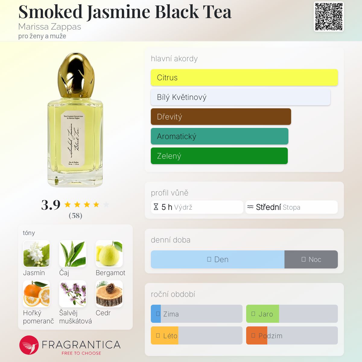 Smoked Jasmine Black Tea podle Marissa Zappas je vůně pro ženy a muže. Smoked Jasmine Black Tea byl/a uveden/a v roce 2022. "Nosem" za touto vůní je Marissa Zappas. Vrchní tóny jsou Bergamot, Hořký pomeranč a Šalvěj muškátová; střední tóny jsouJasmín, Černý čaj a Kořen orris ; základní tóny jsou Cedr a Kadidlo.