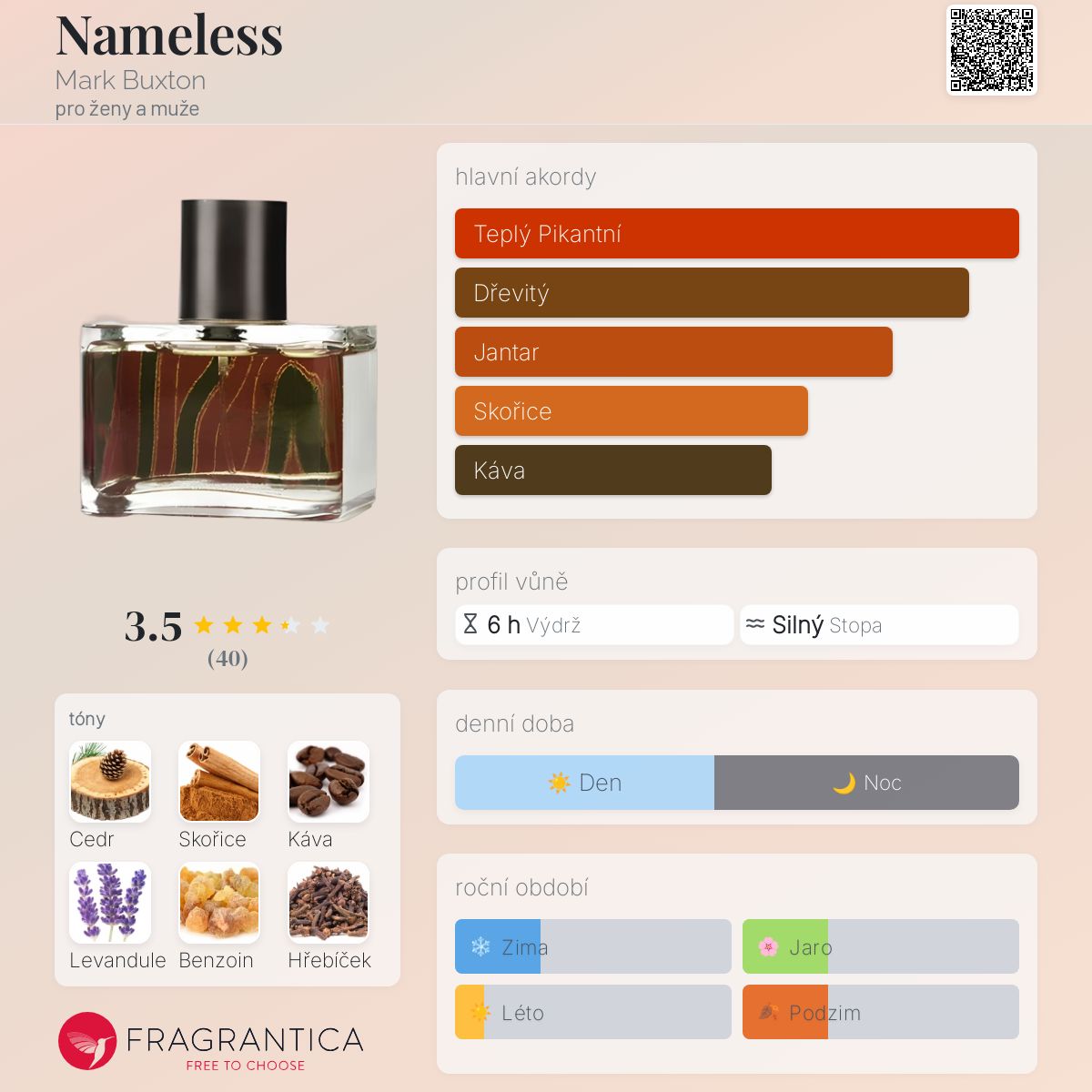 Nameless podle Mark Buxton je Woody Aromatic vůně pro ženy a muže. Nameless byl/a uveden/a v roce 2008. "Nosem" za touto vůní je Mark Buxton. Vrchní tóny jsou Levandule, Kardamom, Mandarinka a Pomerančový květ; střední tóny jsouSkořice, Káva, Hřebíček a Jasmín ; základní tóny jsou Cedr, Benzoin, Dřevité tóny, Jantar (ambra), Francouzské labdanum, Guajakové dřevo a Pačuli.