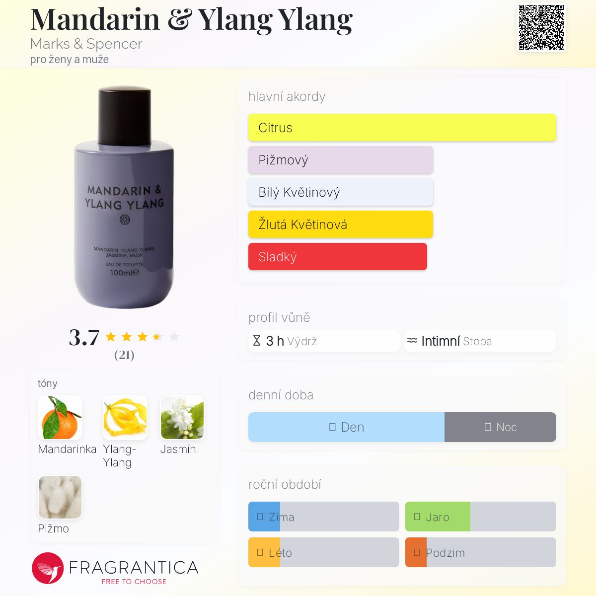 Mandarin & Ylang Ylang podle Marks & Spencer je Floral Fruity vůně pro ženy a muže. Vrchní tón je Mandarinka ; střední tóny jsouYlang-Ylang a Jasmín ; základní tón je Pižmo.