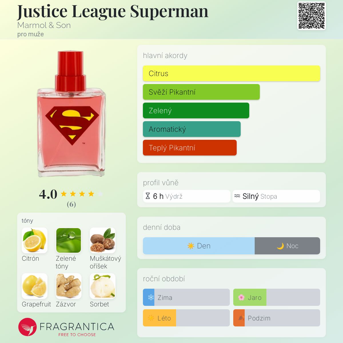 Justice League Superman podle Marmol & Son je Aromatic Green vůně pro muže. Vrchní tóny jsou Citrón, Zázvor, Sorbet a Ozonové tóny; střední tóny jsouZelené tóny, Muškátový oříšek a Krvavý grep ; základní tóny jsou Jantar (ambra) a Egyptské pižmo.