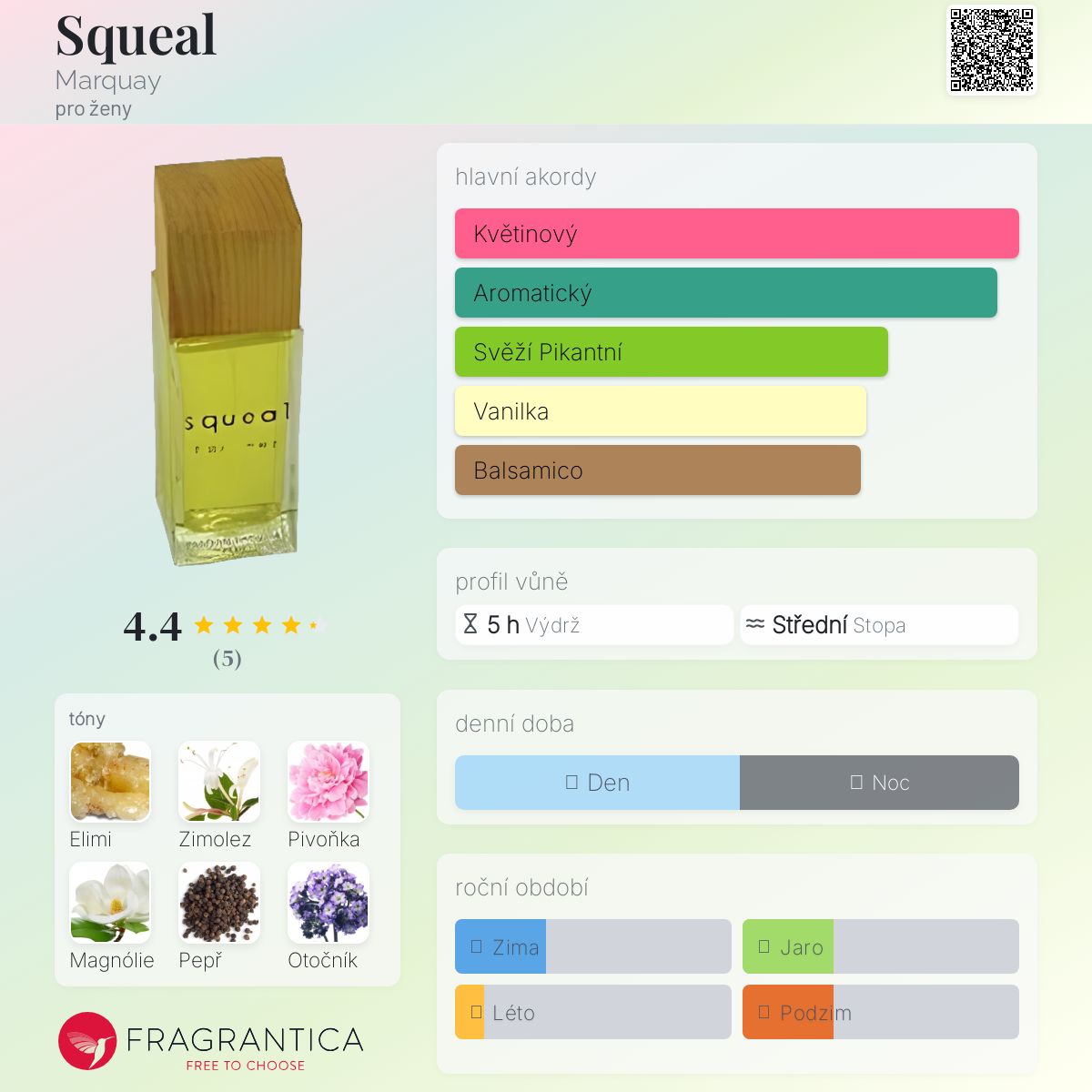 Squeal podle Marquay je Floral vůně pro ženy. Vrchní tóny jsou Elimi, Zimolez, Pivoňka a Magnólie; střední tóny jsouPepř, Otočník a Levandule ; základní tóny jsou Jantar (ambra), Vanilka a Orchidej.
