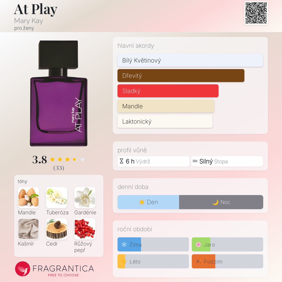 At Play podle Mary Kay je Floral vůně pro ženy. At Play byl/a uveden/a v roce 2019. Vrchní tóny jsou Růžový pepř, Mandarinka, Červené jablko a Sicilský bergamot; střední tóny jsouIndická tuberóza, Gardénie, Jasmín a Ylang-Ylang ; základní tóny jsou Mandle, Kašmír, Extrakt z bílého cedru, Vanilka, Oheň a Mléko.